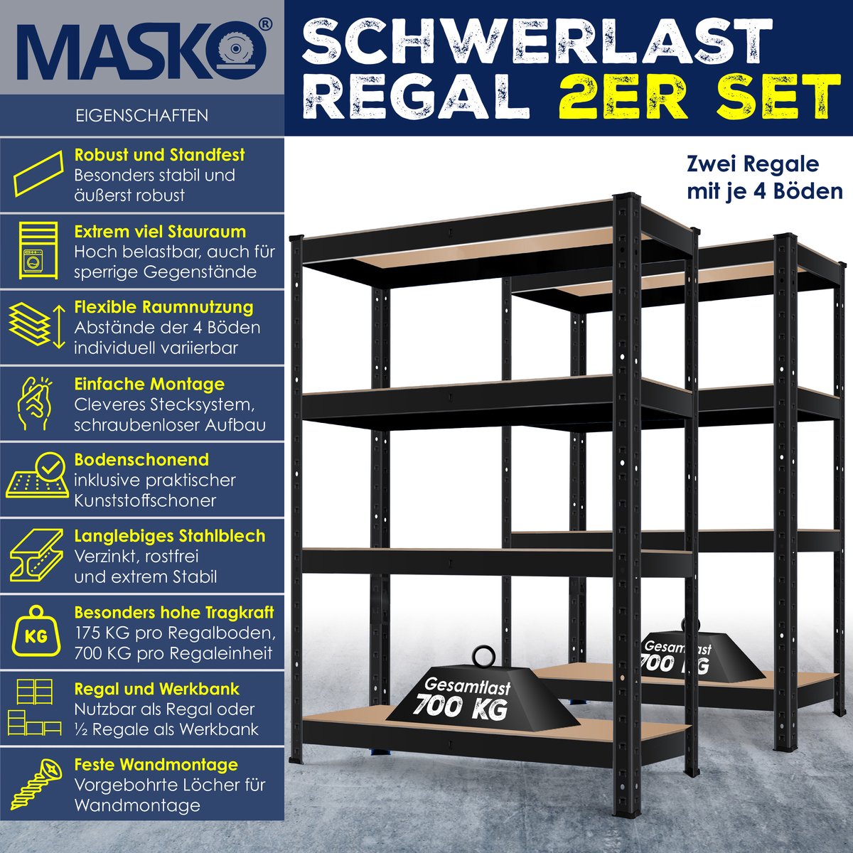 Dit hoogwaardige MASKO opbergrek is gemaakt van gegalvaniseerd metaal en meerdere MDF-platen. De stevige constructie biedt plaats aan 175 kg per etage. Het rek kan afzonderlijk worden gebruikt of in combinatie met andere planken van hetzelfde type voor een uitbreiding van de opslagruimte die voldoet aan uw verschillende behoeften.