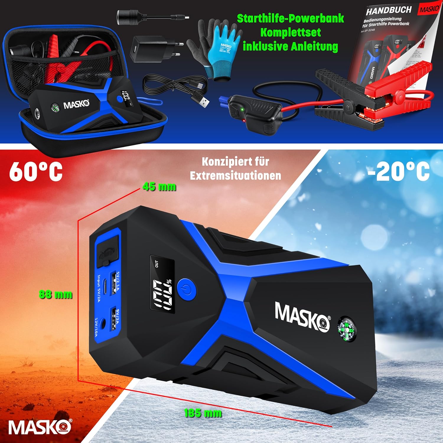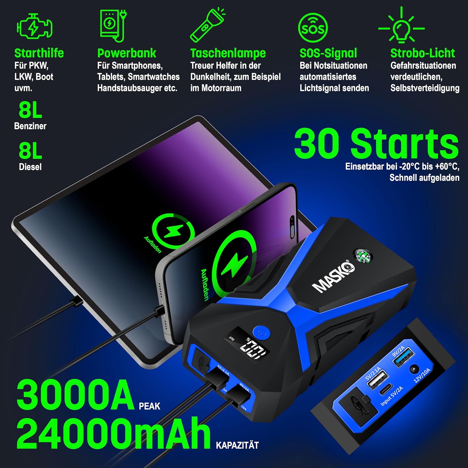 MASKO® Starthulp powerbank auto 3000A piekstroom 24000mAh (tot 8,0L benzine of 8L diesel) met LED-zaklamp, voor 12V-voertuigen batterij starter SUV motorfiets ATV grasmaaier, incl. handschoenen