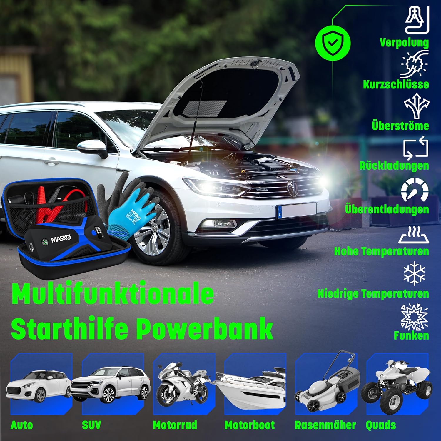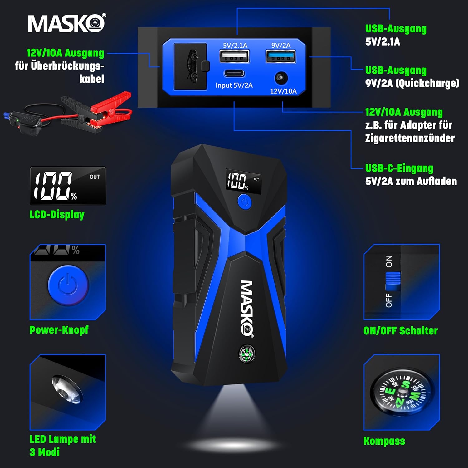 Krachtige powerbank: de powerbank gaat verder dan alleen starthulp. Met een USB-uitgang van 5 V/2,1 A en een QuickCharge USB-uitgang van 9 V/2 A maakt het opladen van je elektronische apparaten onderweg mogelijk. Of het nu gaat om smartphone, tablet, draagbare muziekbox of andere USB-aangedreven apparaten - de MASKO powerbank levert de benodigde energie om je altijd verbonden en entertainment te houden. Bovendien biedt hij een 12 V/10 A-uitgang.