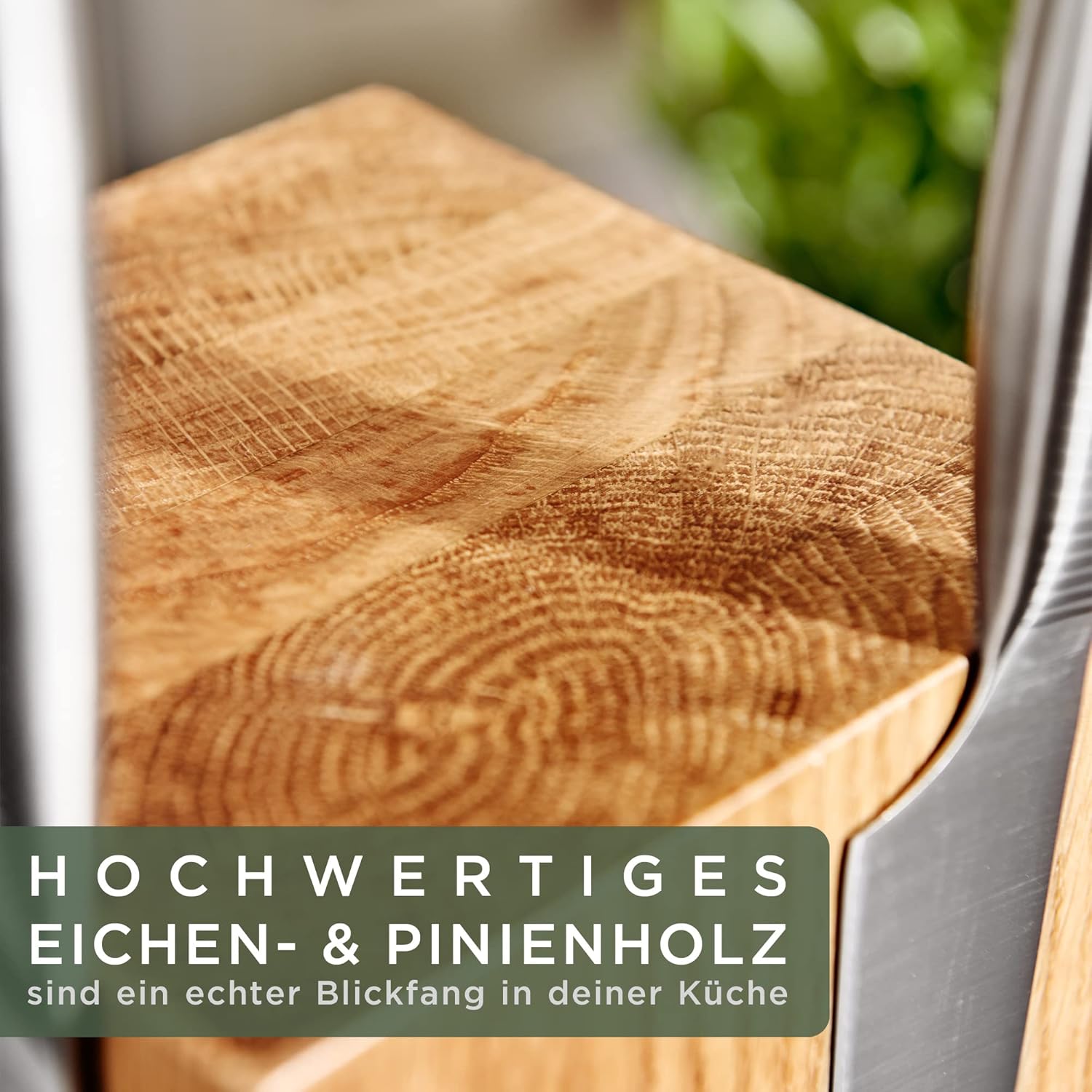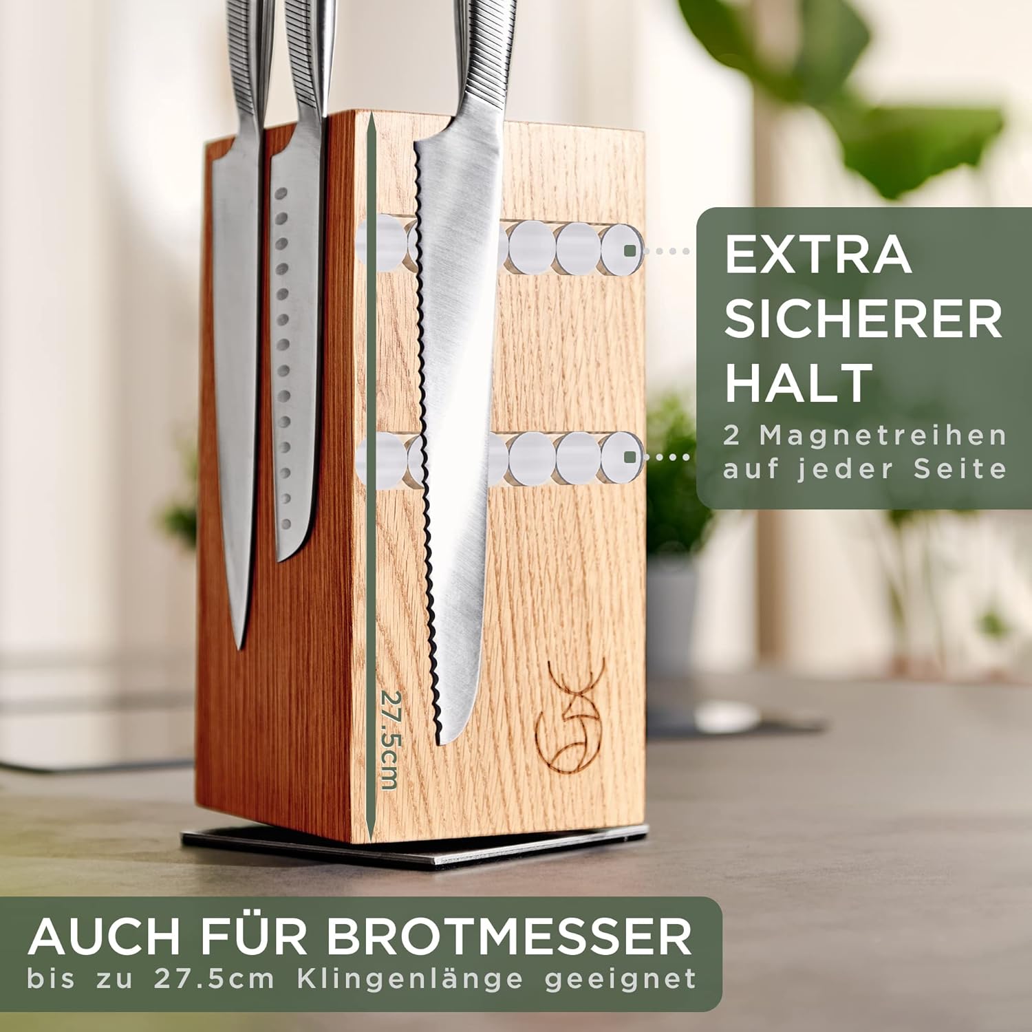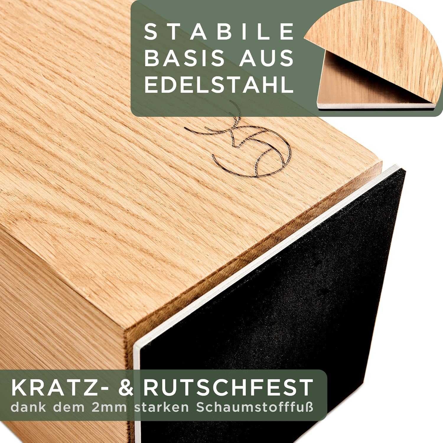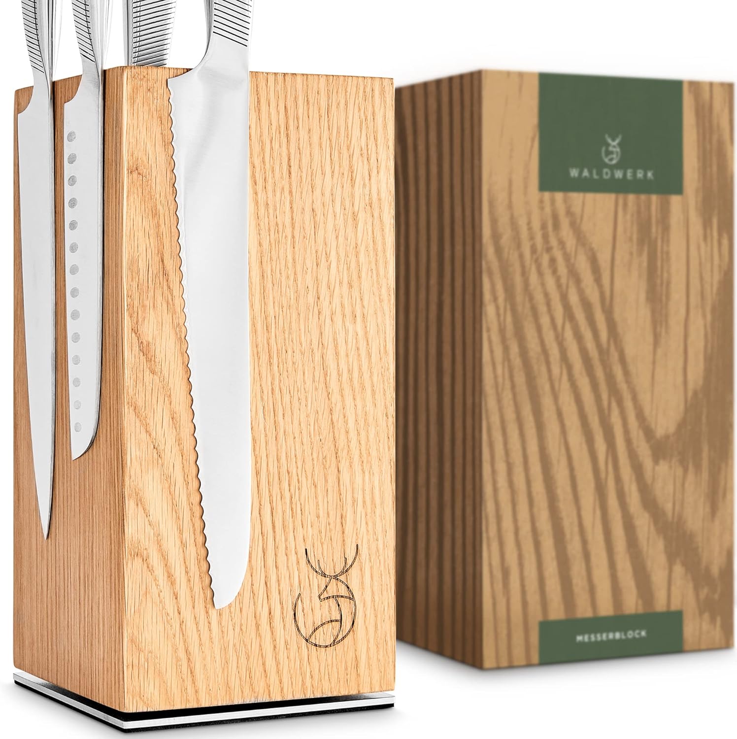 • Elegante materialen: hoogwaardig eikenhout en roestvrij staal garanderen een maximale duurzaamheid. Het eikenhout garandeert een bijzonder duurzame en mesvriendelijke steun voor je messen.