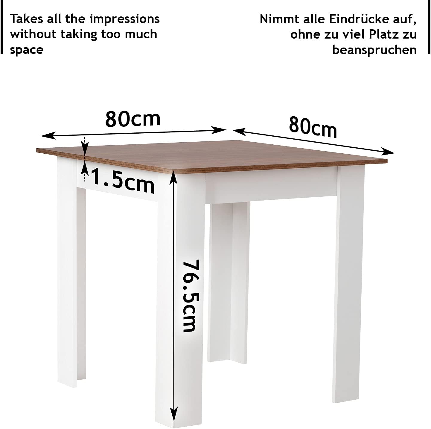 Afmetingen: Totaal (l x b x h): ca. 80 x 80 x 76,5 cm. Tafelblad (l x b x h): ca. 80 x 80 x 1,5 cm. Tafelpoot (l x b x h): ca. 10 x 10 x 75 cm. Gewicht: ca. 16 kg. Inclusief montagemateriaal. Beschikbare kleuren: wit, zwart, walnoot