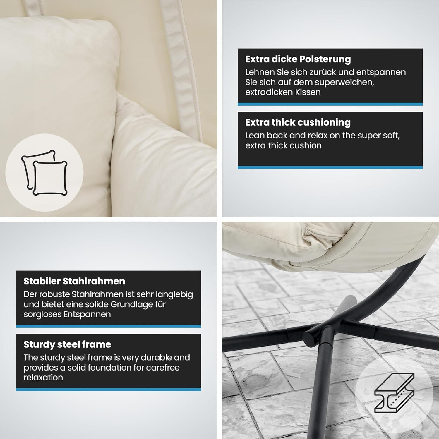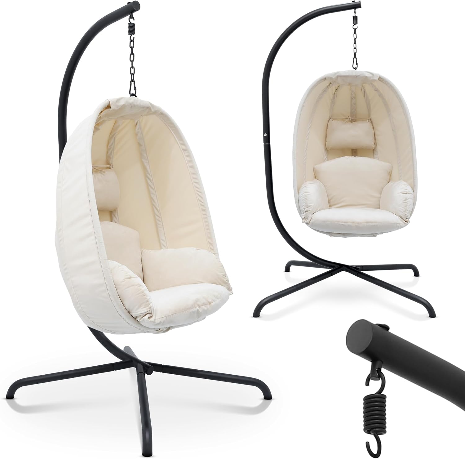 MIADOMODO® Hangstoel - met standaard en kussens, in hoogte verstelbaar, frame van ijzer, tot 160 kg belastbaar - ei hangschommel, hangmand, hangstoel, indoor/outdoor, tuin (beige)