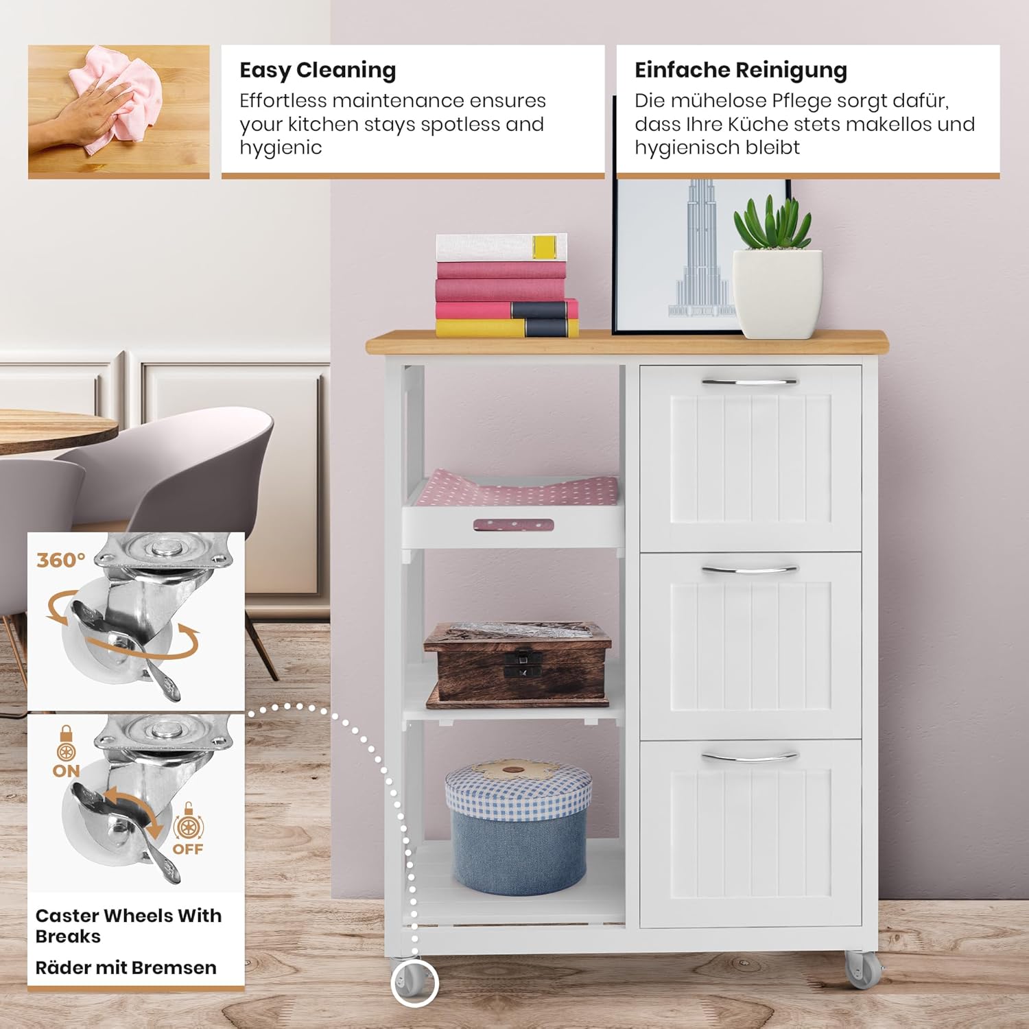 - Landhuisstijl: het natuurlijke werkblad en het witte frame van de grenenhouten trolley zijn een mooie aanvulling op je keukenelementen en passen bij een traditioneel keukendecor