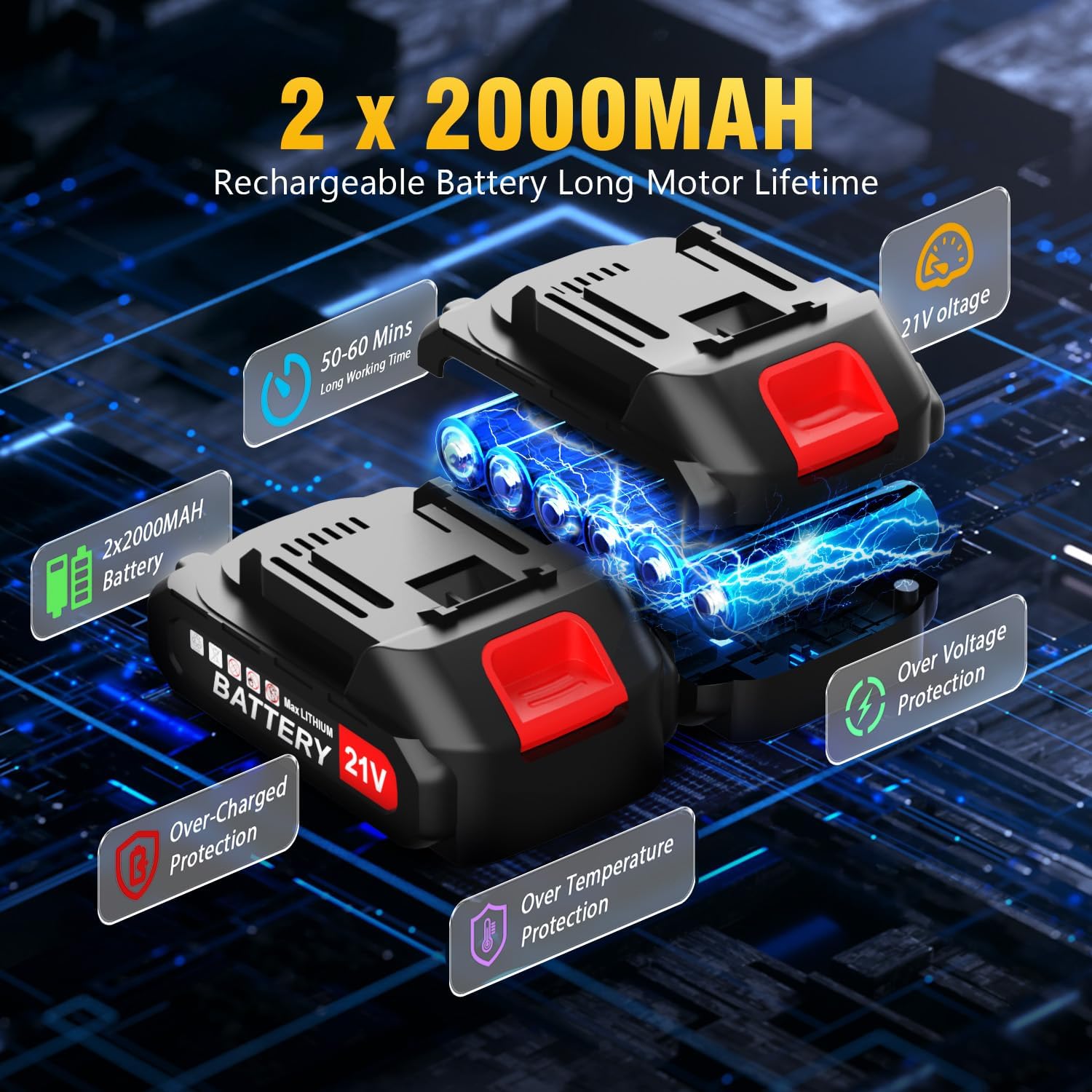 - 2 * 2000mAh verwisselbare accu's - Deze draadloze kettingzaag is uitgerust met twee 2000mAh accu's en één oplader, die in slechts 2 uur volledig kunnen worden opgeladen en de kettingzaag ongeveer 30 minuten lang laten werken. Deze kettingzaag is bovendien compatibel met andere 21V Makita accu's, zodat u zich geen zorgen hoeft te maken over stroomproblemen en altijd en overal kunt genieten van tuinplezier.