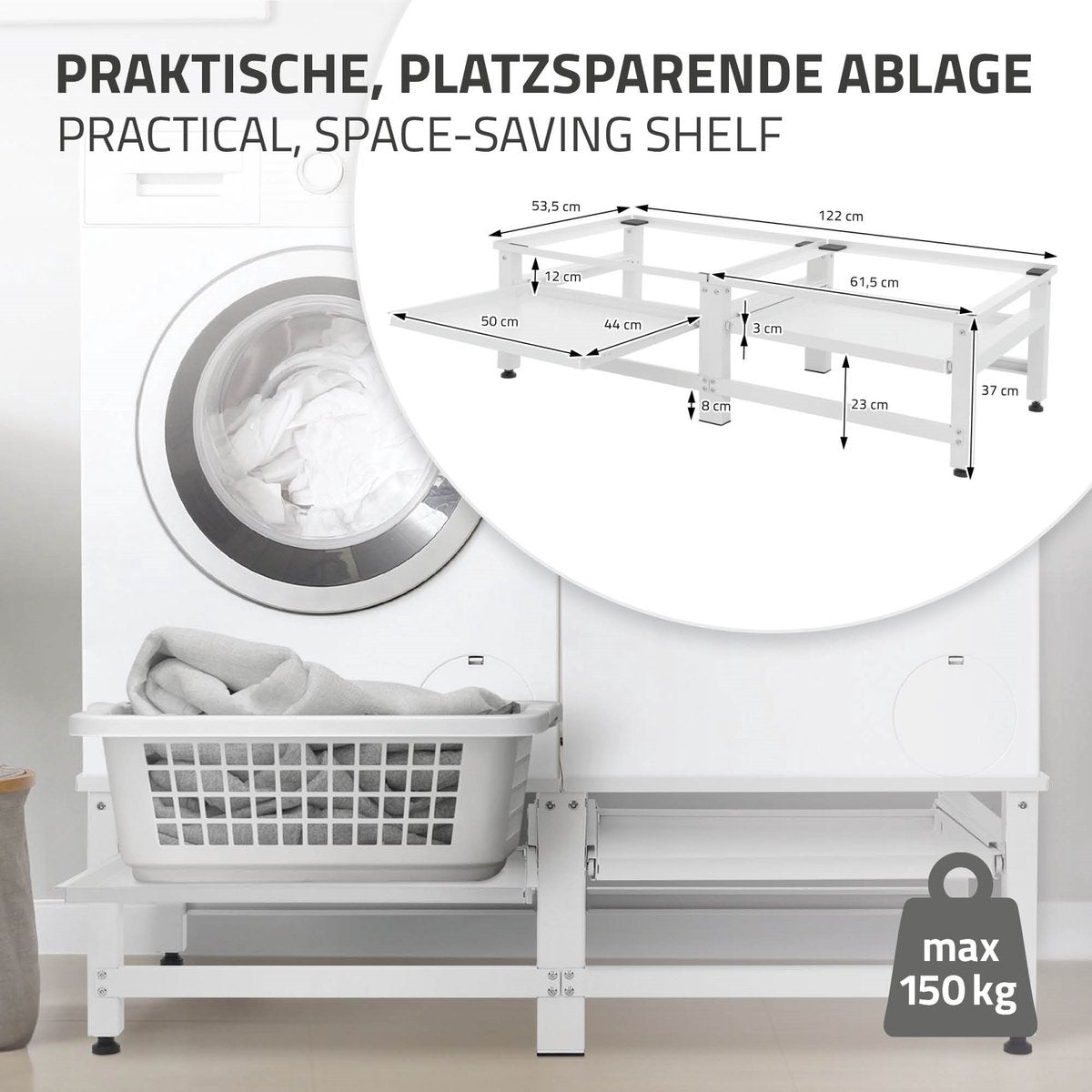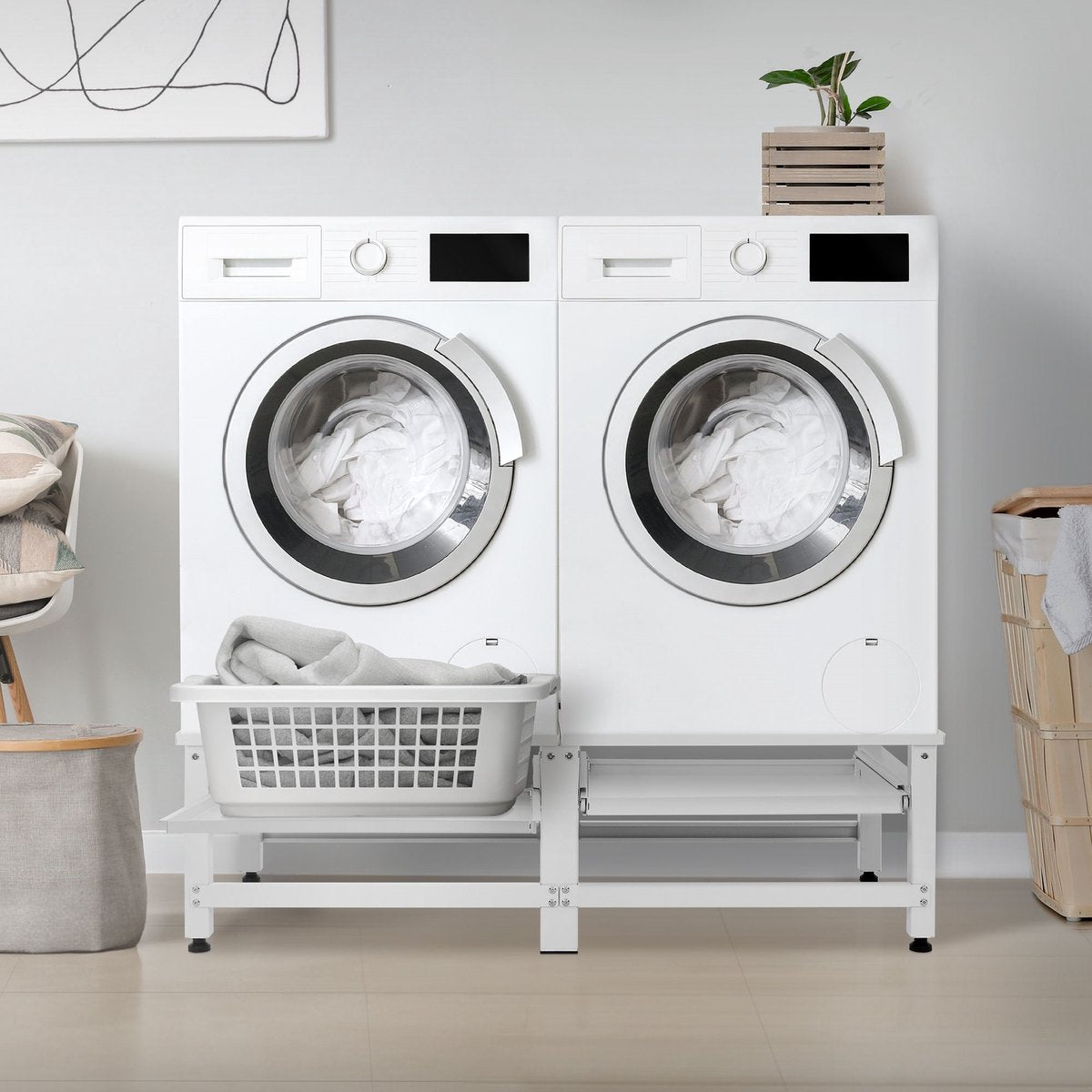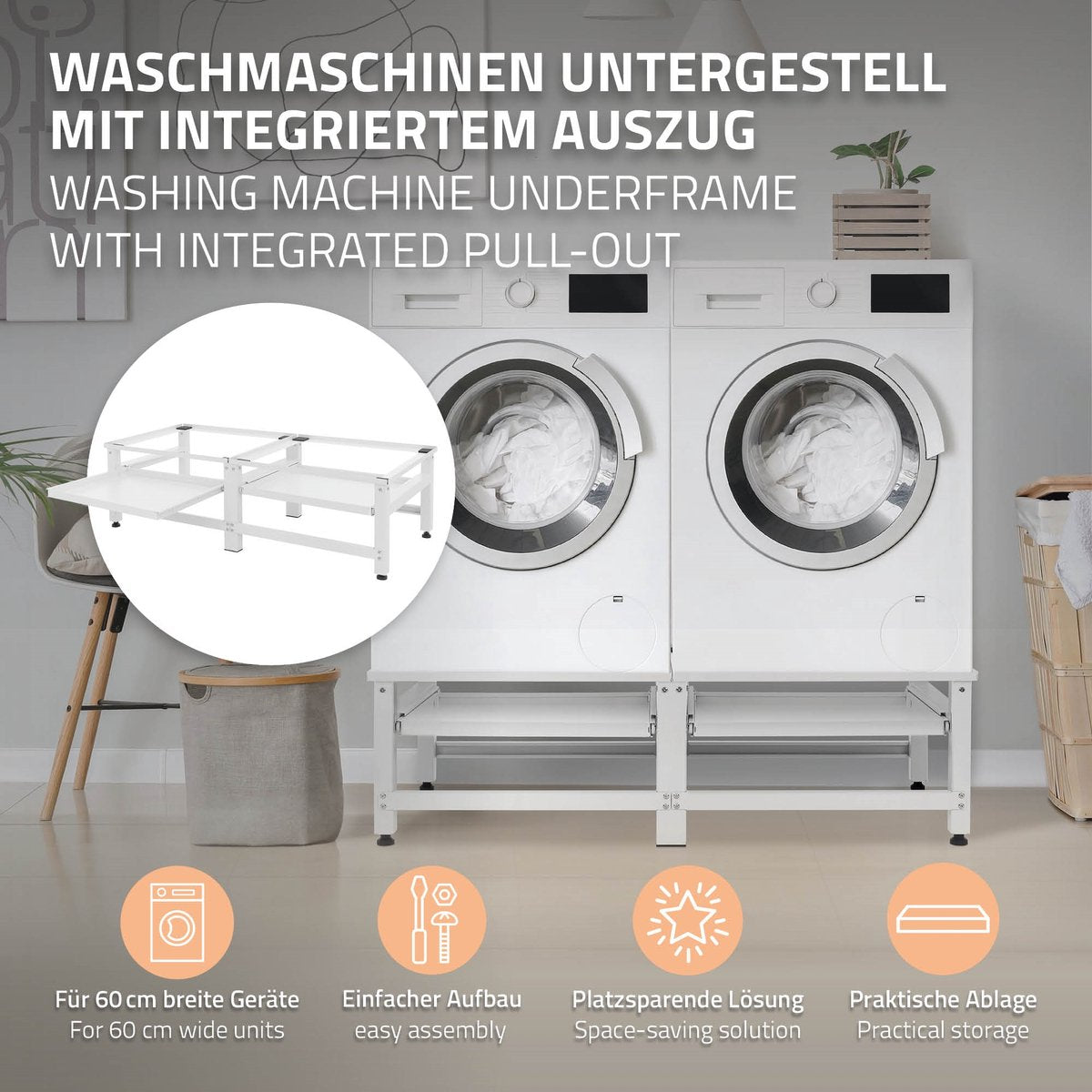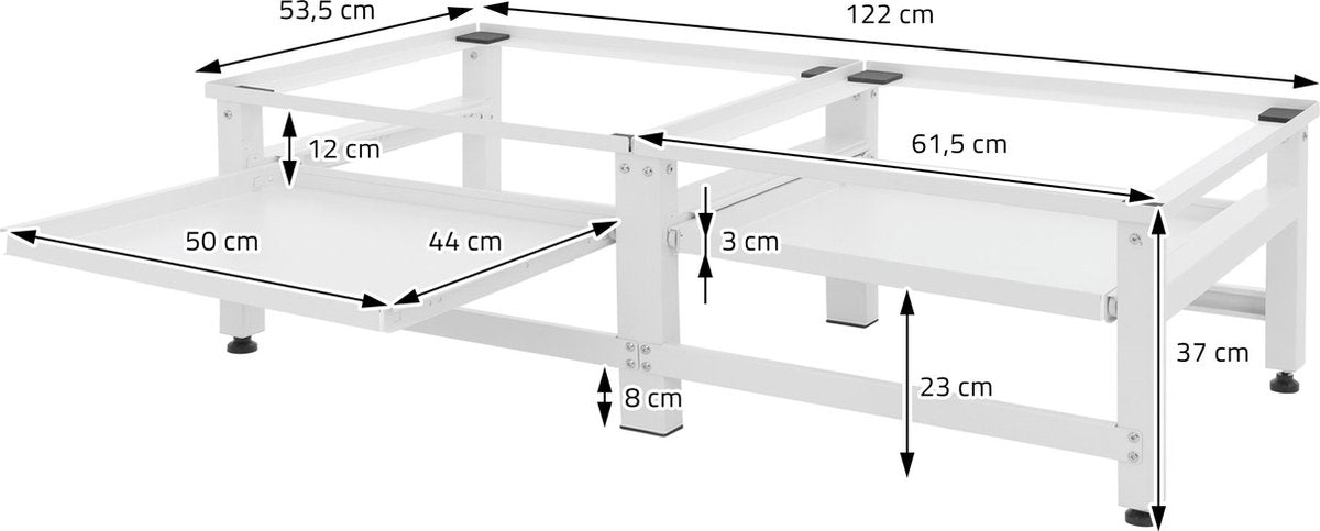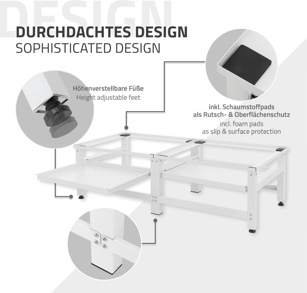 Wasmachinevoet met uitschuifbaar plateau? Geen enkel probleem. Dit stalen onderstel is de perfecte verhoging voor je wasmachine en droger. Het stalen frame heeft een uittrekbare plank waarop je kleinere spullen kunt plaatsen, zodat ze altijd binnen handbereik zijn. Het frame is geschikt voor wasmachines met een breedte tot 60 cm. Als je vloer ongelijk is, helpen de in hoogte verstelbare voetjes je. Je kunt ze eenvoudig in- of uitschroeven om de hoogte te verstellen. Op de vier steunpunten van het frame zitten schuimkussentjes, die een dempend effect hebben en zo het geluid van de machines verminderen.