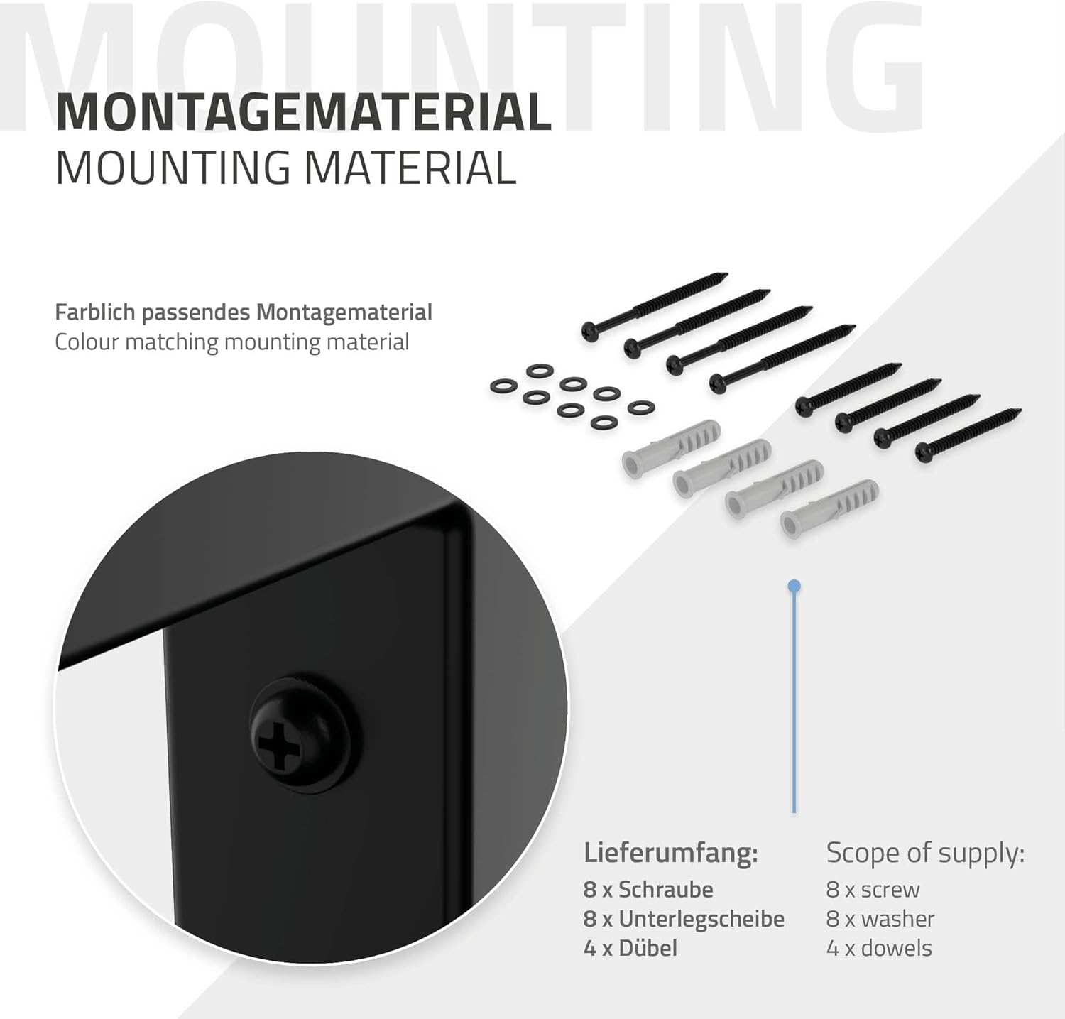 Design wandconsole, zwart.Voor het ontwerpen van eigen meubels.Zwart, zijdemat oppervlak.Twee consoles inbegrepen.Elegant, puristisch design.Montageafstand flexibelIndustrieel design.Perfect frame voor bijvoorbeeld Wastafel, rekken of bureaus