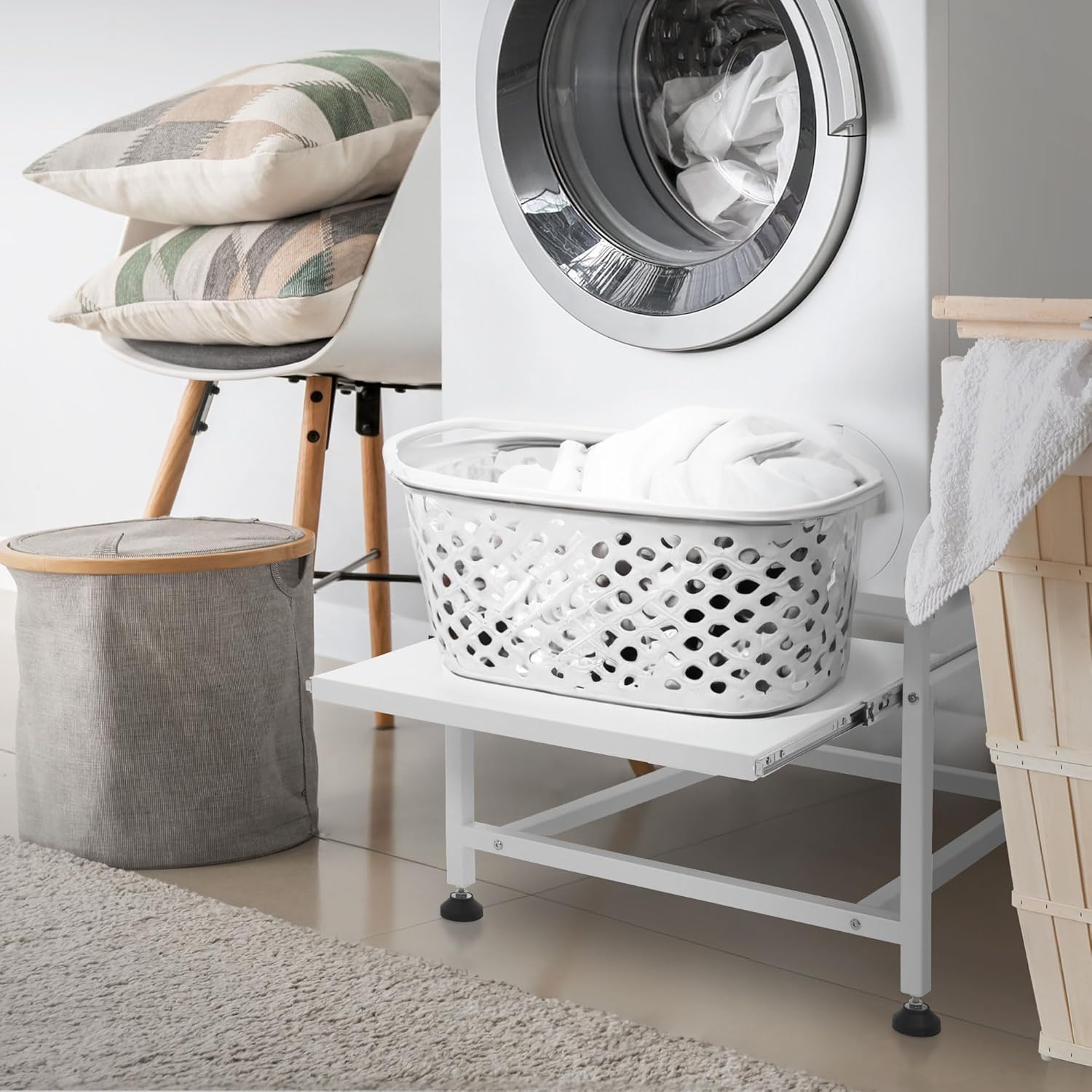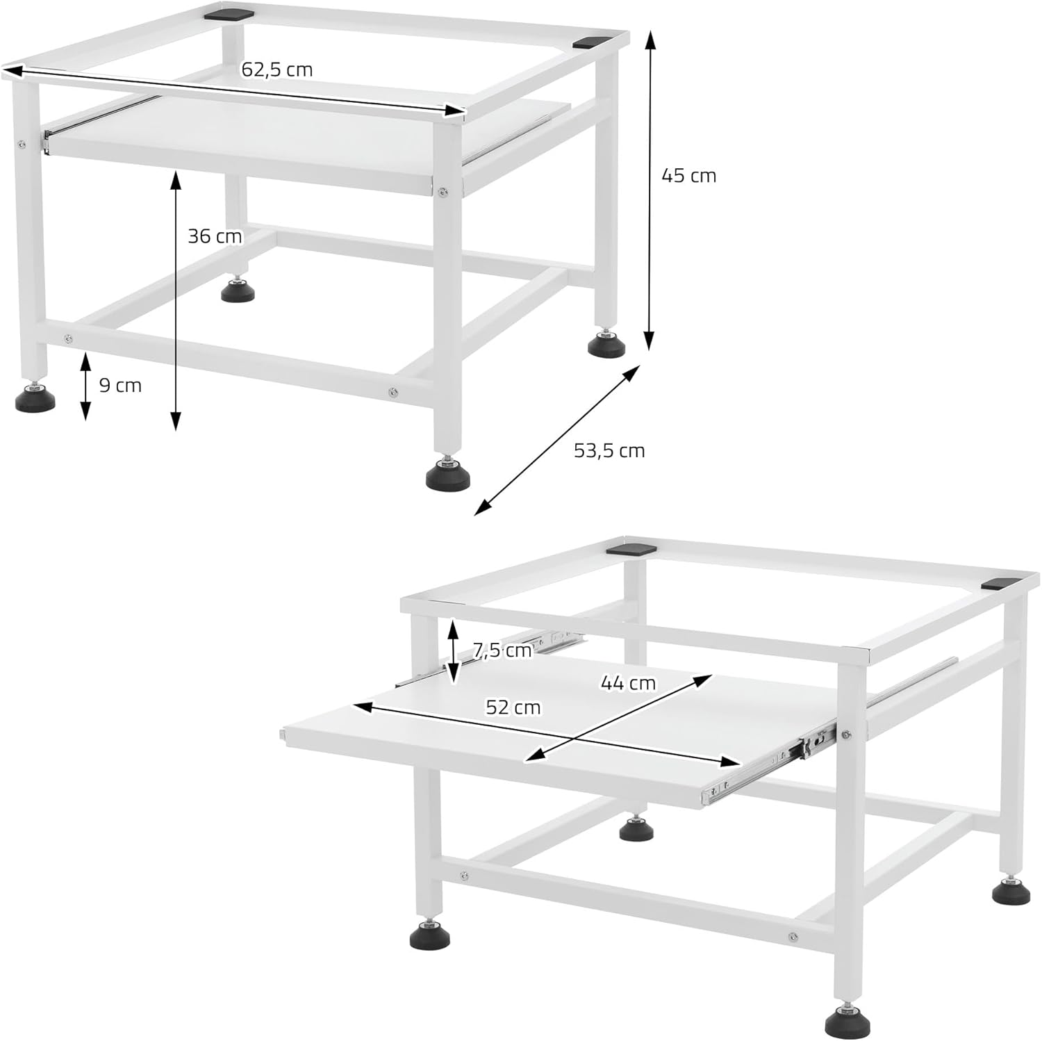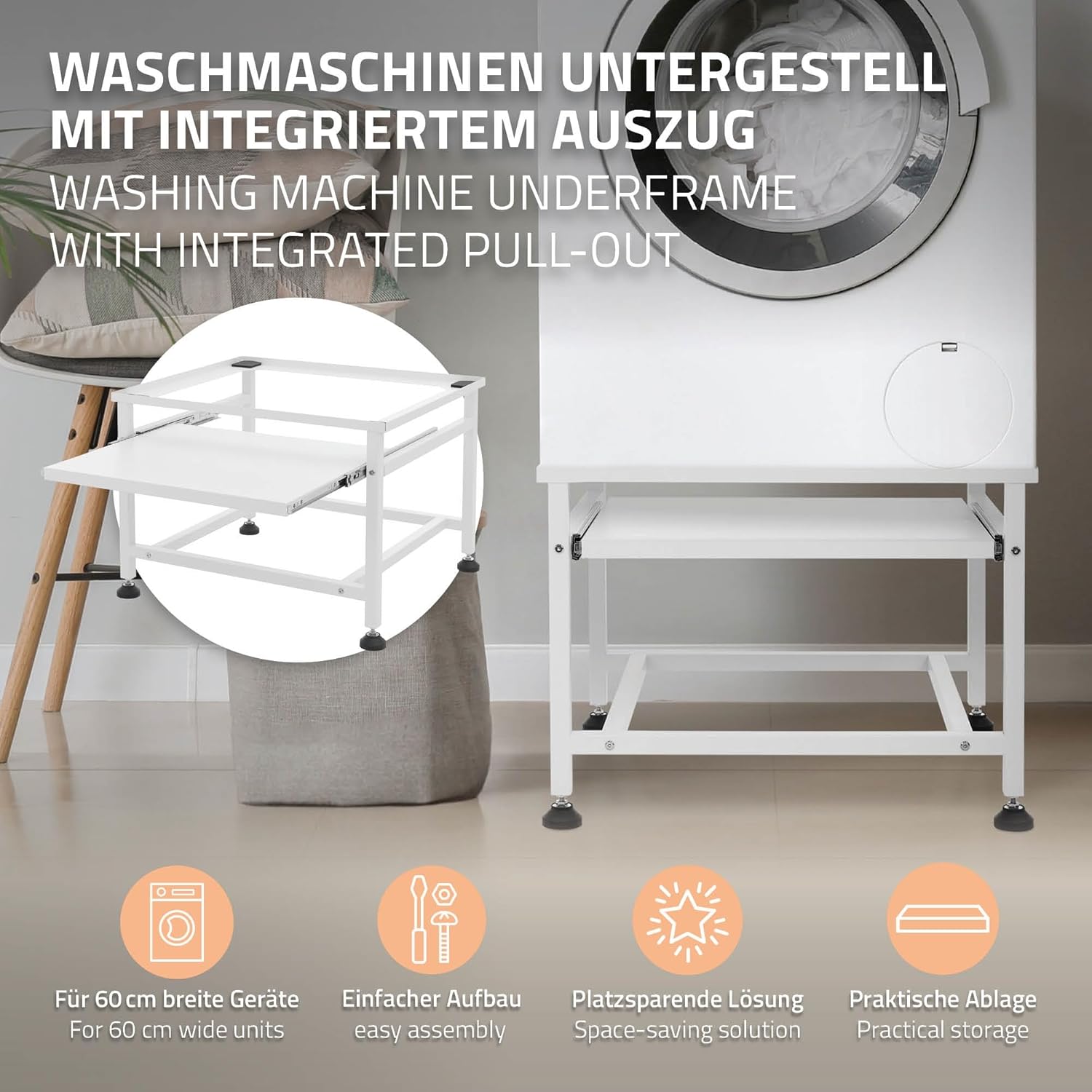 Wasmachine-onderstel met uittrekbare legplank Geen probleem. Dit stalen onderstel is de optimale verhoging voor je wasmachine en droger. Het stalen frame beschikt over een uittrekbare plaat, waarop je kleinere dingen kunt neerleggen en je hebt ze dus altijd binnen handbereik.