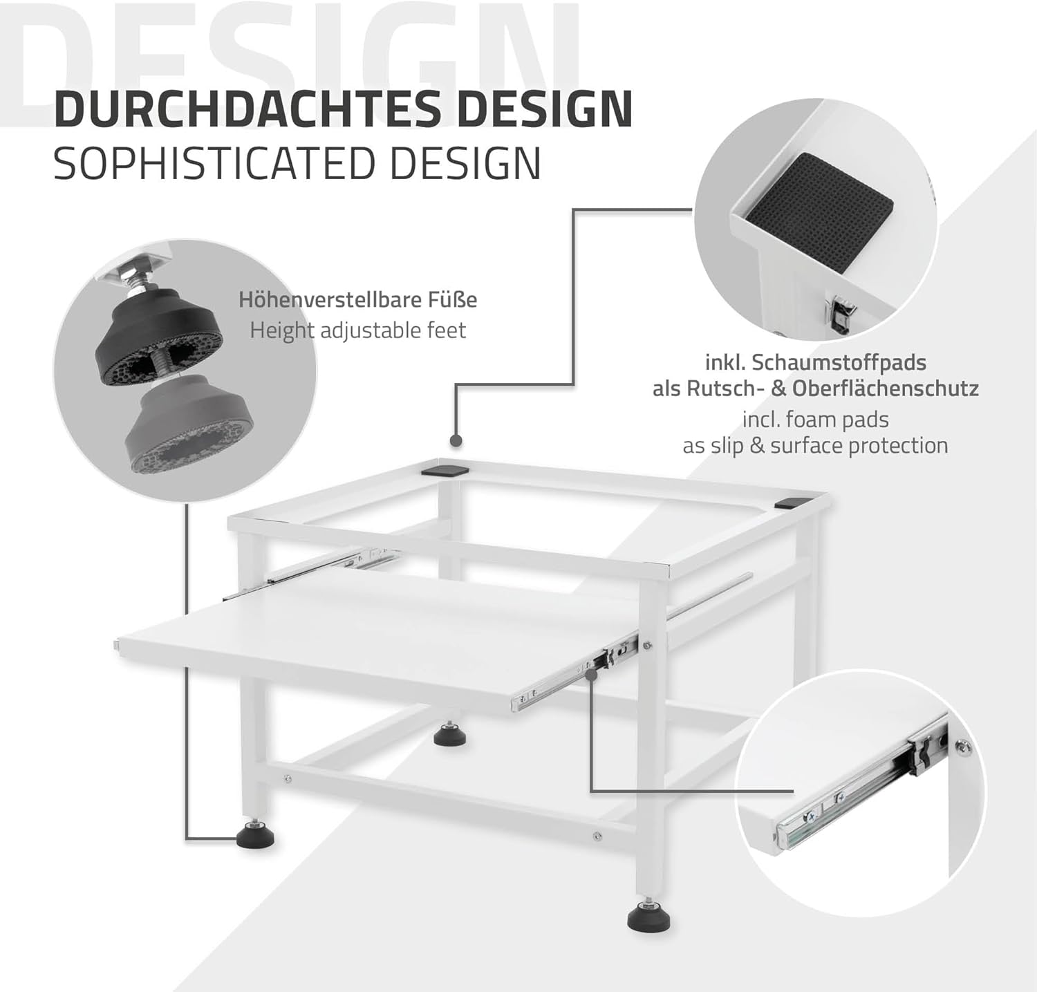 Met intrekbaar dienblad, in hoogte verstelbare voetjes, stabiele stand van de wasmachine door antislip pads van gepoedercoat staal, robuuste stalen constructie, gemakkelijk te reinigen, rubberen voetjes, veilige structuur