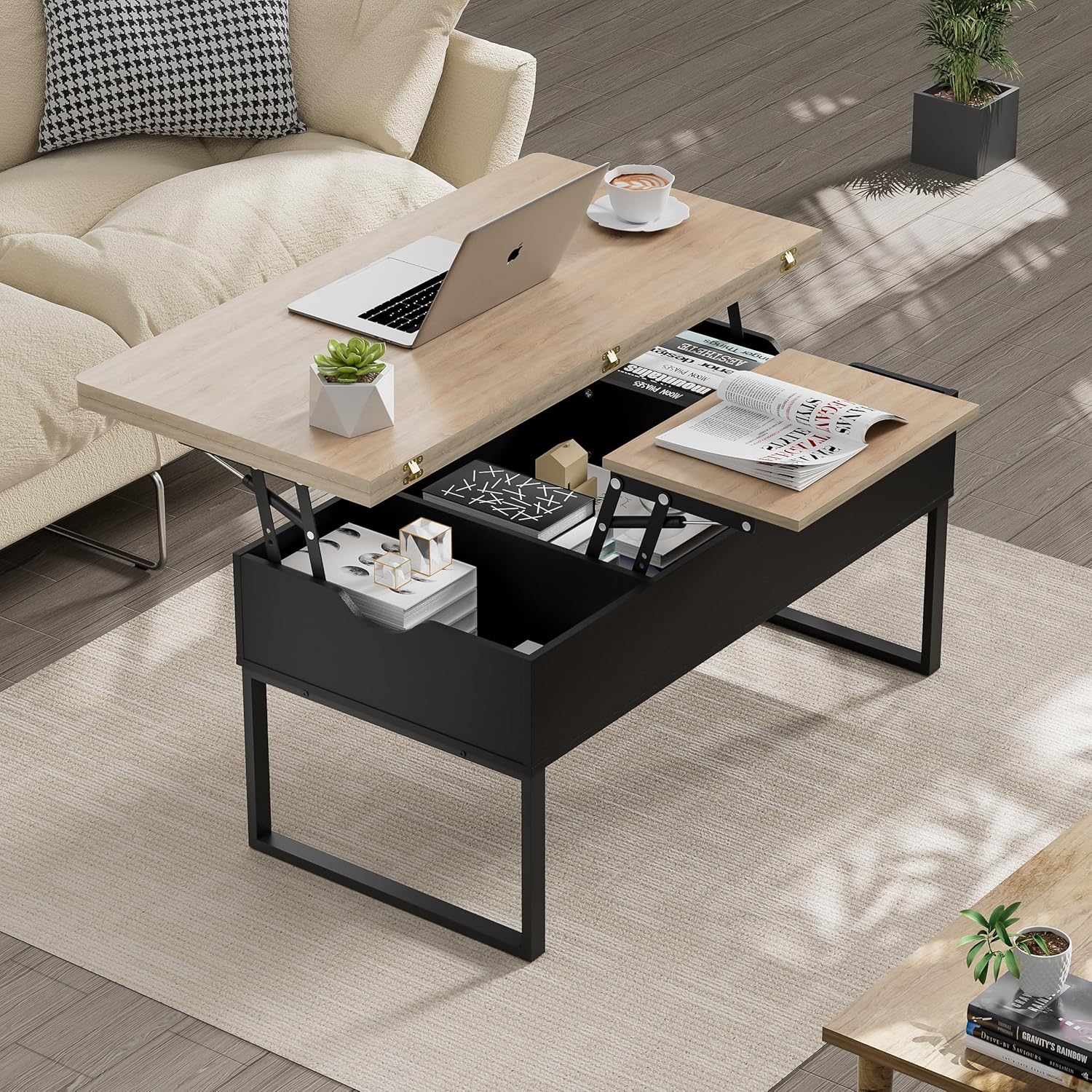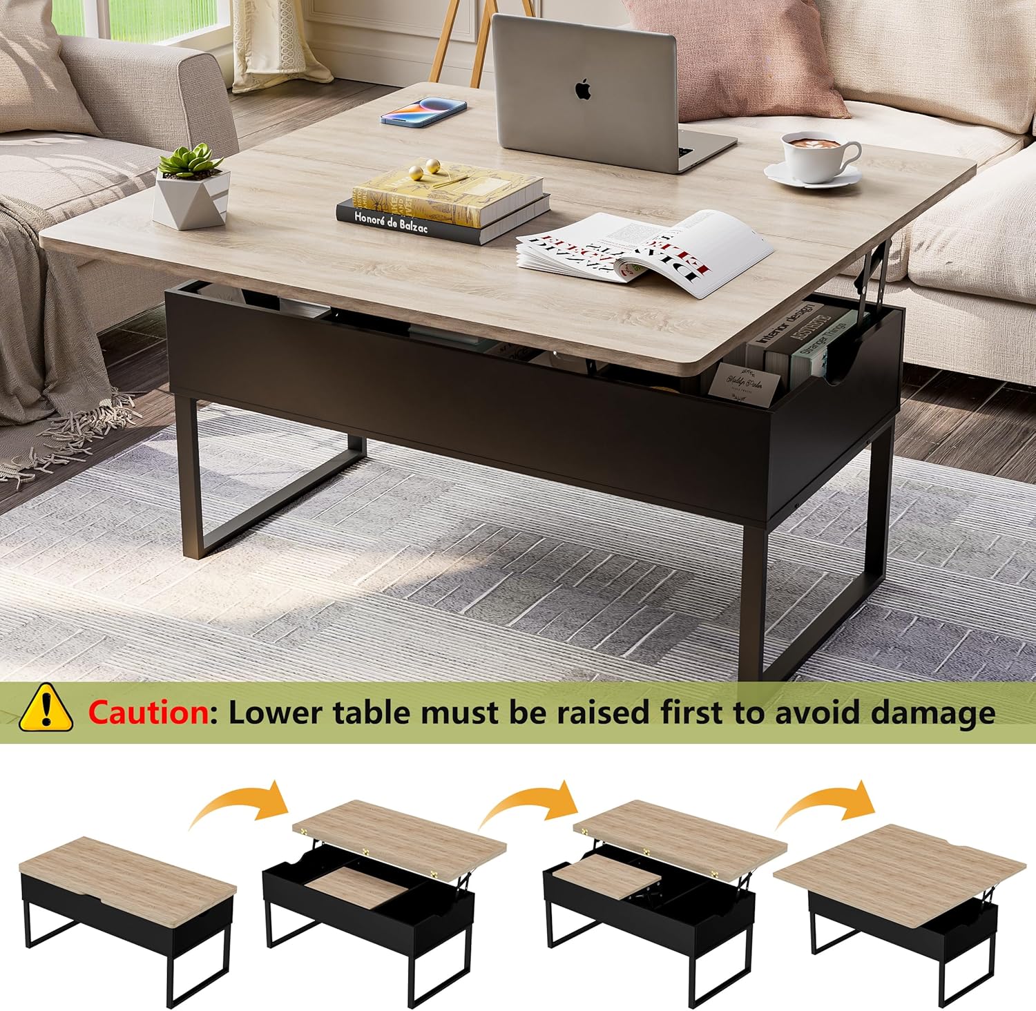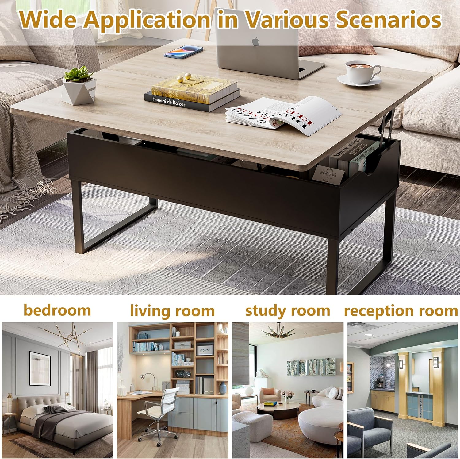 MSFE Lift Top salontafel, 4-in-1 salontafel met opbergruimte, uitschuifbaar bureaublad tot 100*100cm voor 4-8 personen