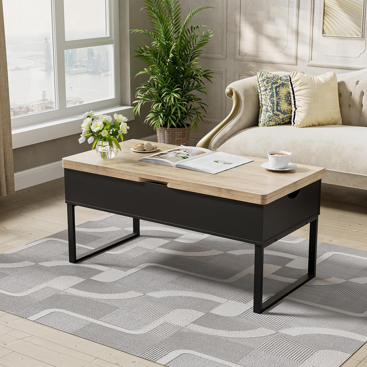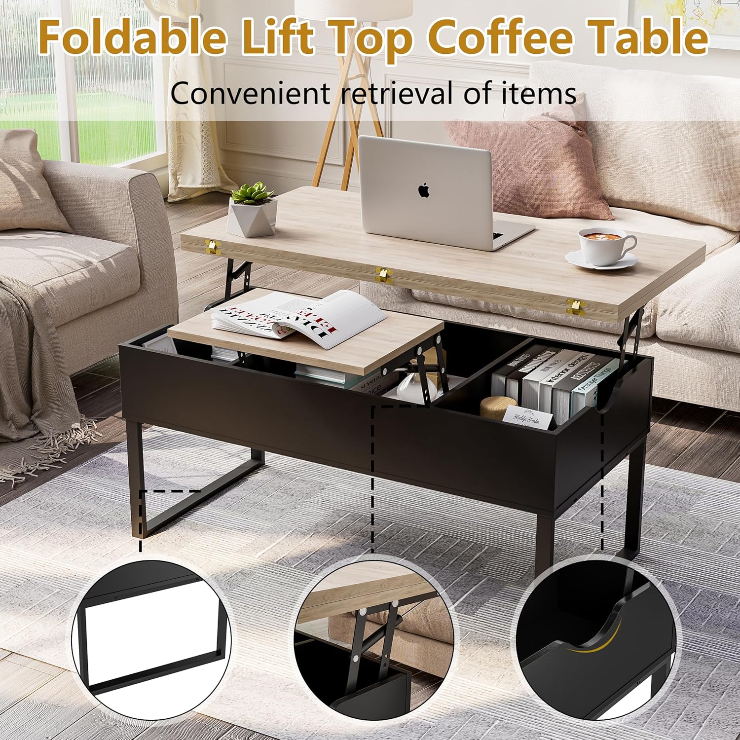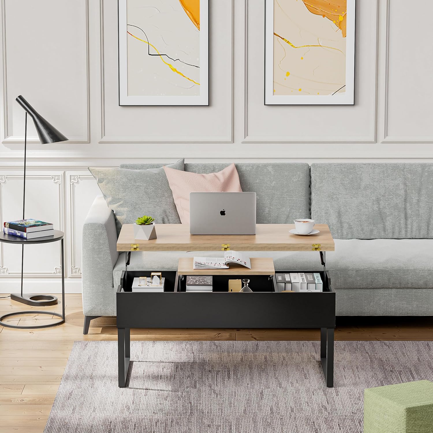 MSFE Lift Top salontafel, 4-in-1 salontafel met opbergruimte, uitschuifbaar bureaublad tot 100*100cm voor 4-8 personen