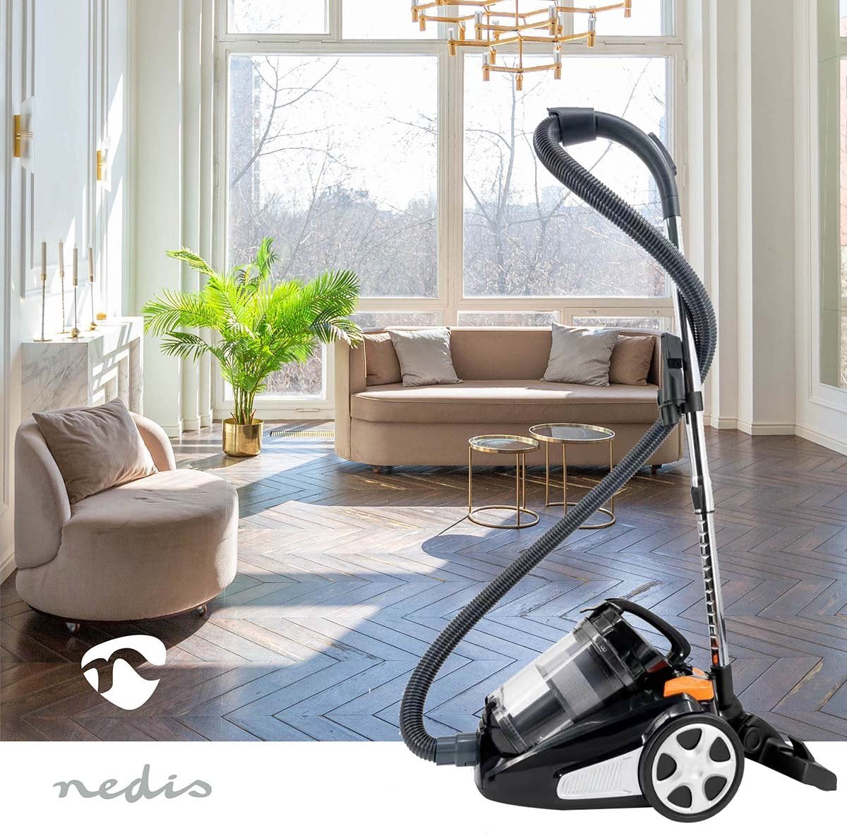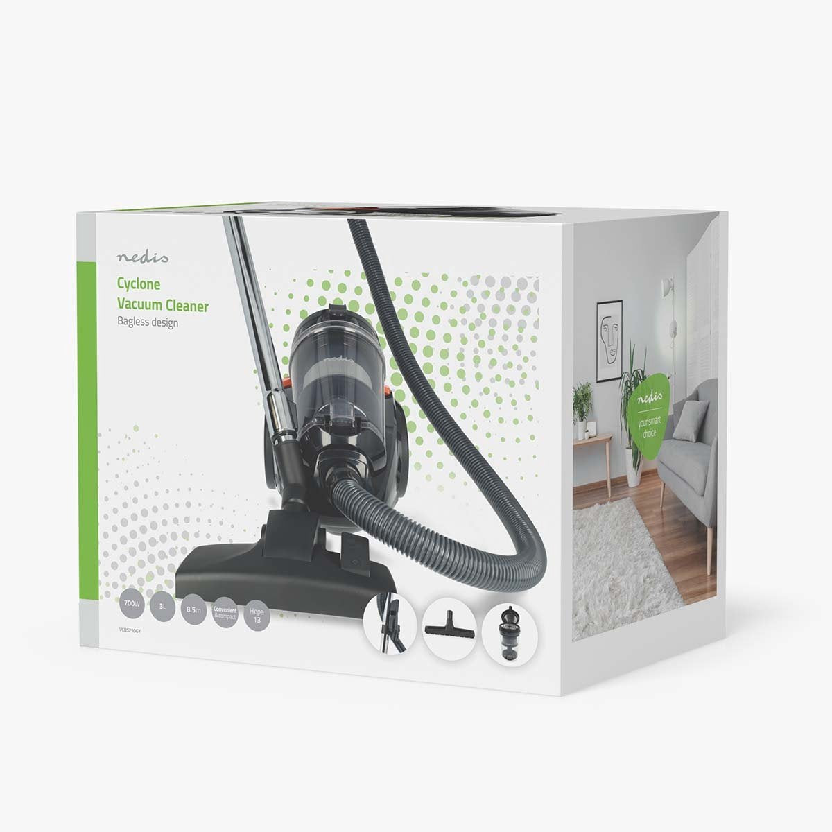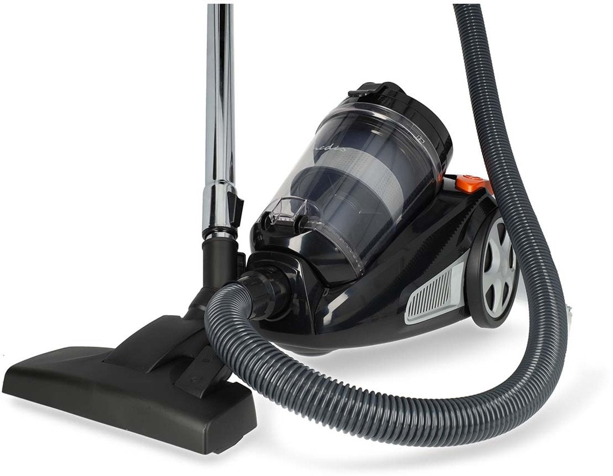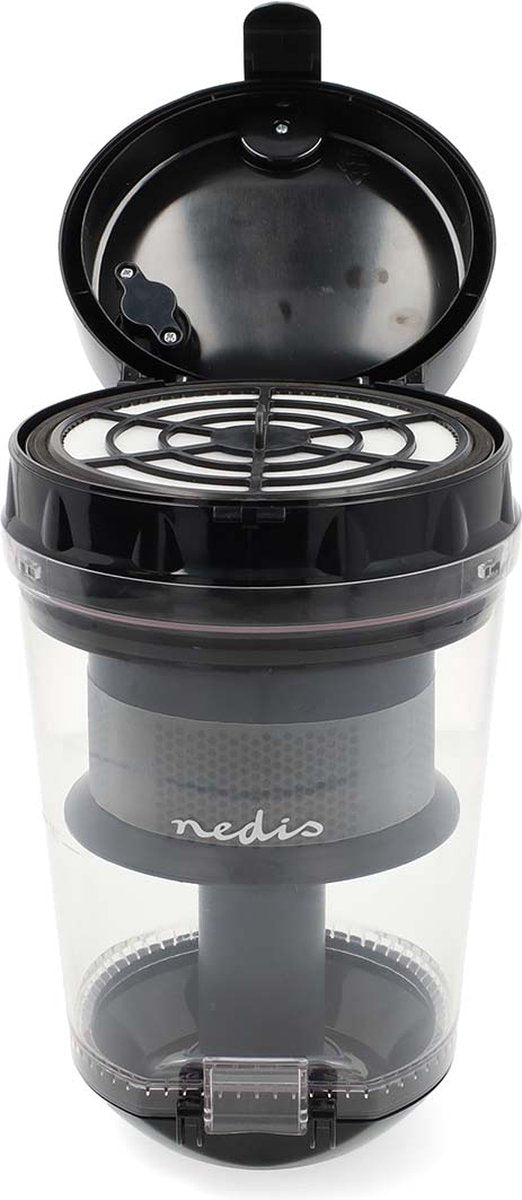 De Nedis zakloze cycloonstofzuiger is een compact en lichtgewicht model voor het moderne huis. Hij heeft een indrukwekkende zuigkracht van 17,5 kPa en een vermogen van 700 watt. De eco-motor werkt met minder dan 76 dB en is dus stiller dan traditionele motoren.