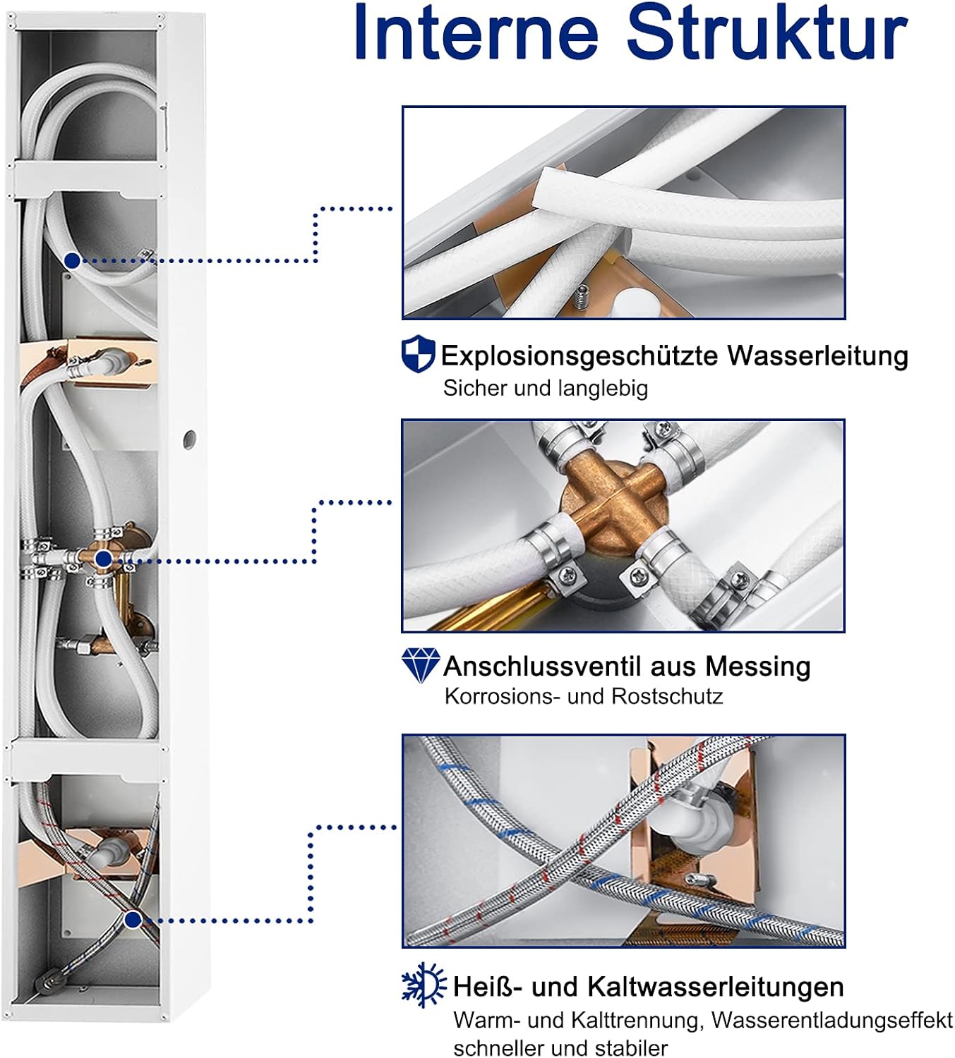 De totale afmetingen van de douchecabine zijn 47 x 15 x 115 cm (L x B x H). Dit formaat is groot genoeg voor extra plezier onder de douche. Het roestvrije materiaal van het geborstelde oppervlak geeft uw badkamer een elegante en hoogwaardige uitstraling.