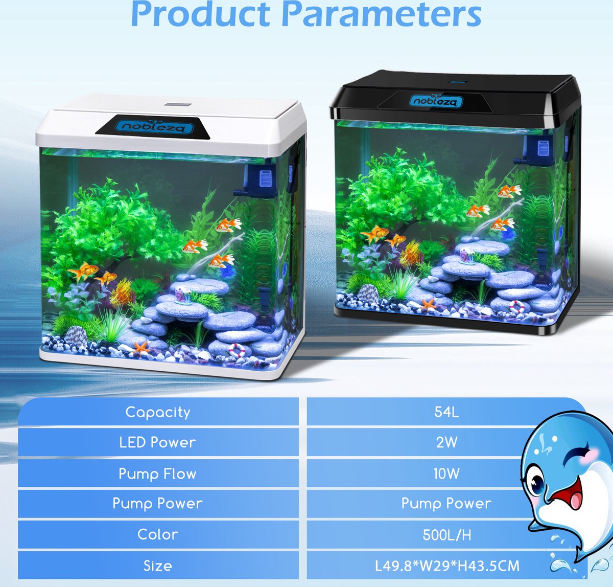 Dit is een compleet aquarium van 54 liter met deksel, LED-verlichting, filterschuim en geïntegreerde pomp, ideaal voor beginners.