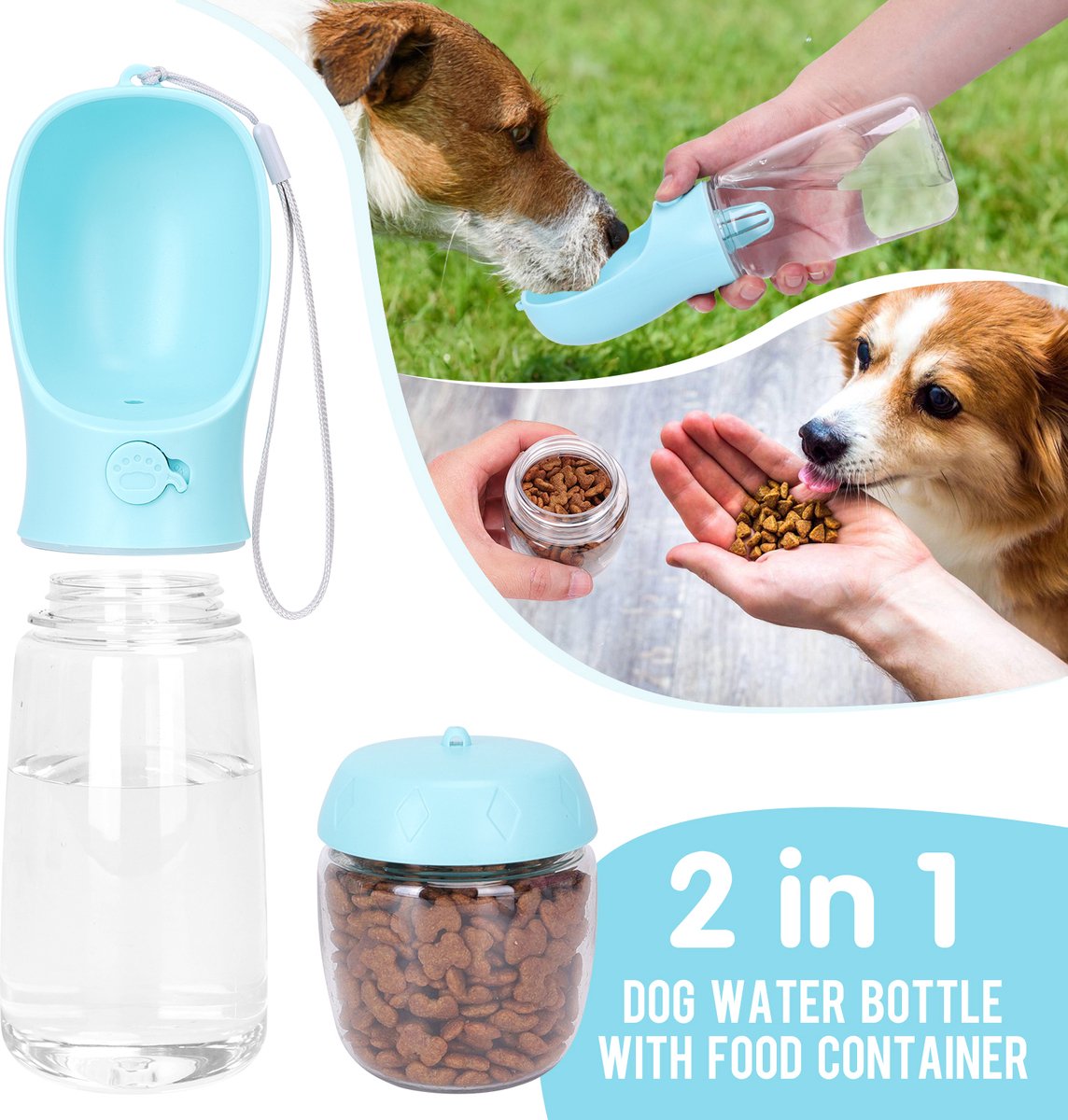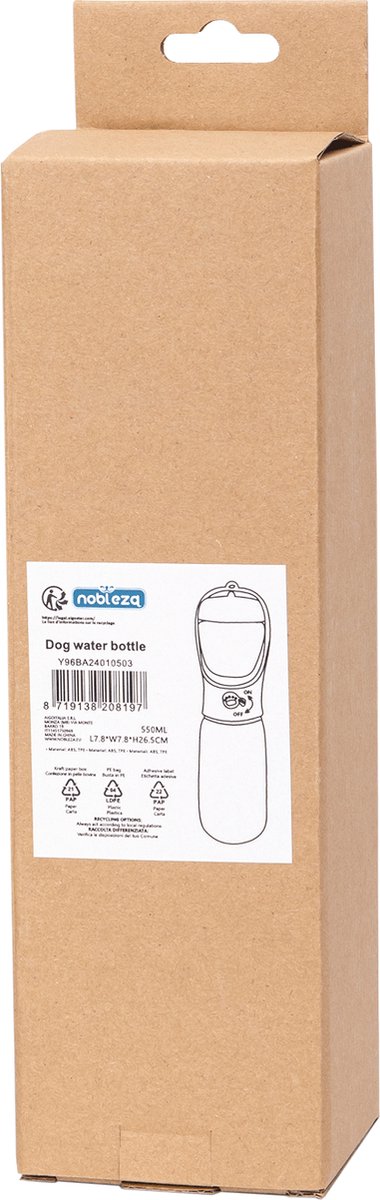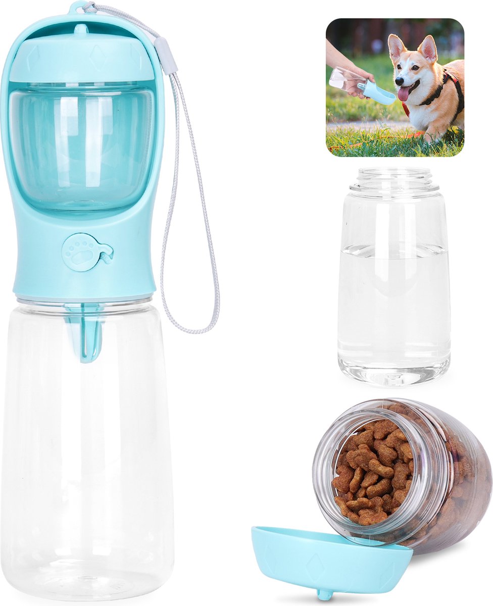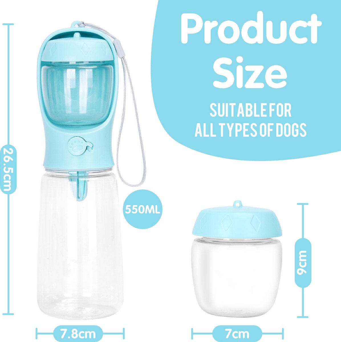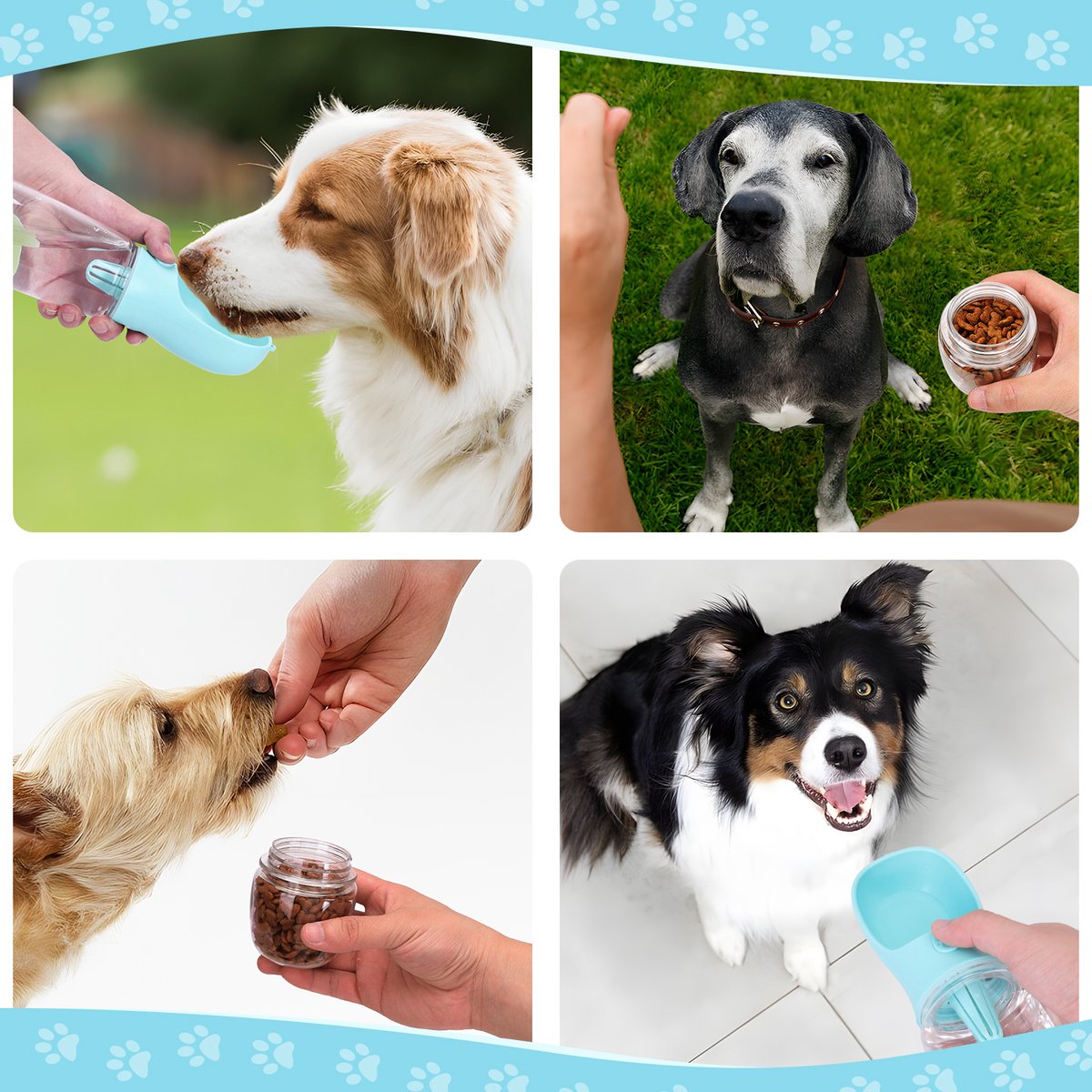 Ongerust dat je hond dorst krijgt wanneer je buiten bent? Met de Nobleza huisdierwaterfles kun je 550 ml water en 150 ml voer meenemen. Met een druk op de knop giet de fles water in de meegeleverde minikom en hevelt ongebruikt water terug in de fles. Super handig en praktisch voor buiten en elke dag!