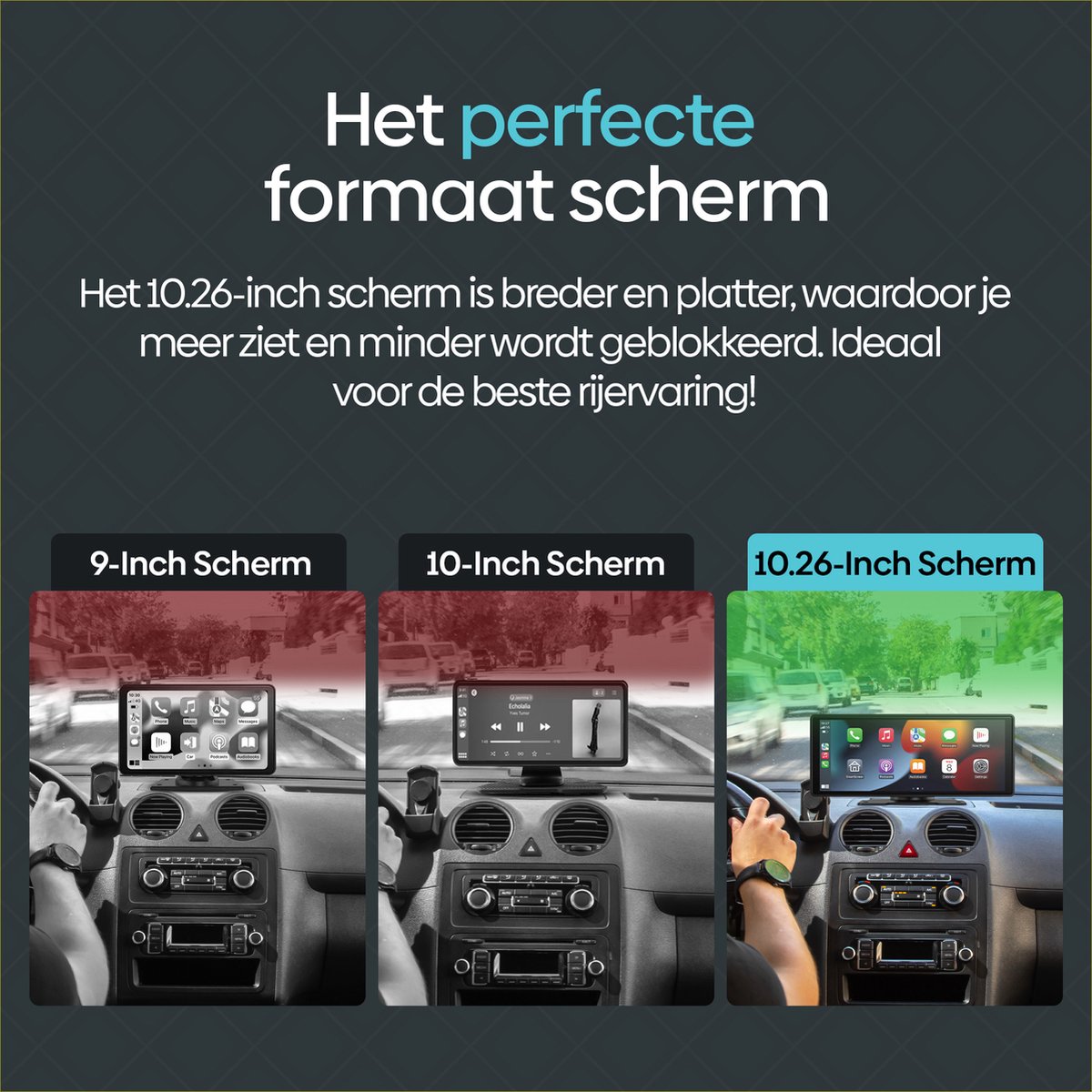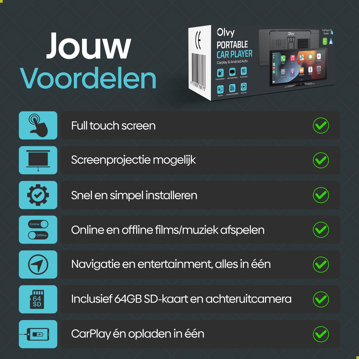 Wil je het gemak van Apple Carplay en Android Auto in je auto, maar heeft je huidige systeem deze functies nog niet? Geen zorgen! Met het Olvy Carplay Scherm kun je eenvoudig je auto upgraden naar een modern navigatiesysteem. Dit universele scherm werkt met zowel Apple als Android-apparaten en is in een handomdraai te installeren, zonder dat je de huidige autoradio hoeft te vervangen. Koppel je telefoon draadloos via Carplay of Android Auto, en geniet onderweg van je favoriete apps. Dankzij Bluetooth bel je eenvoudig handsfree, en met Screen Mirror projecteer je je telefoon direct op het scherm.
