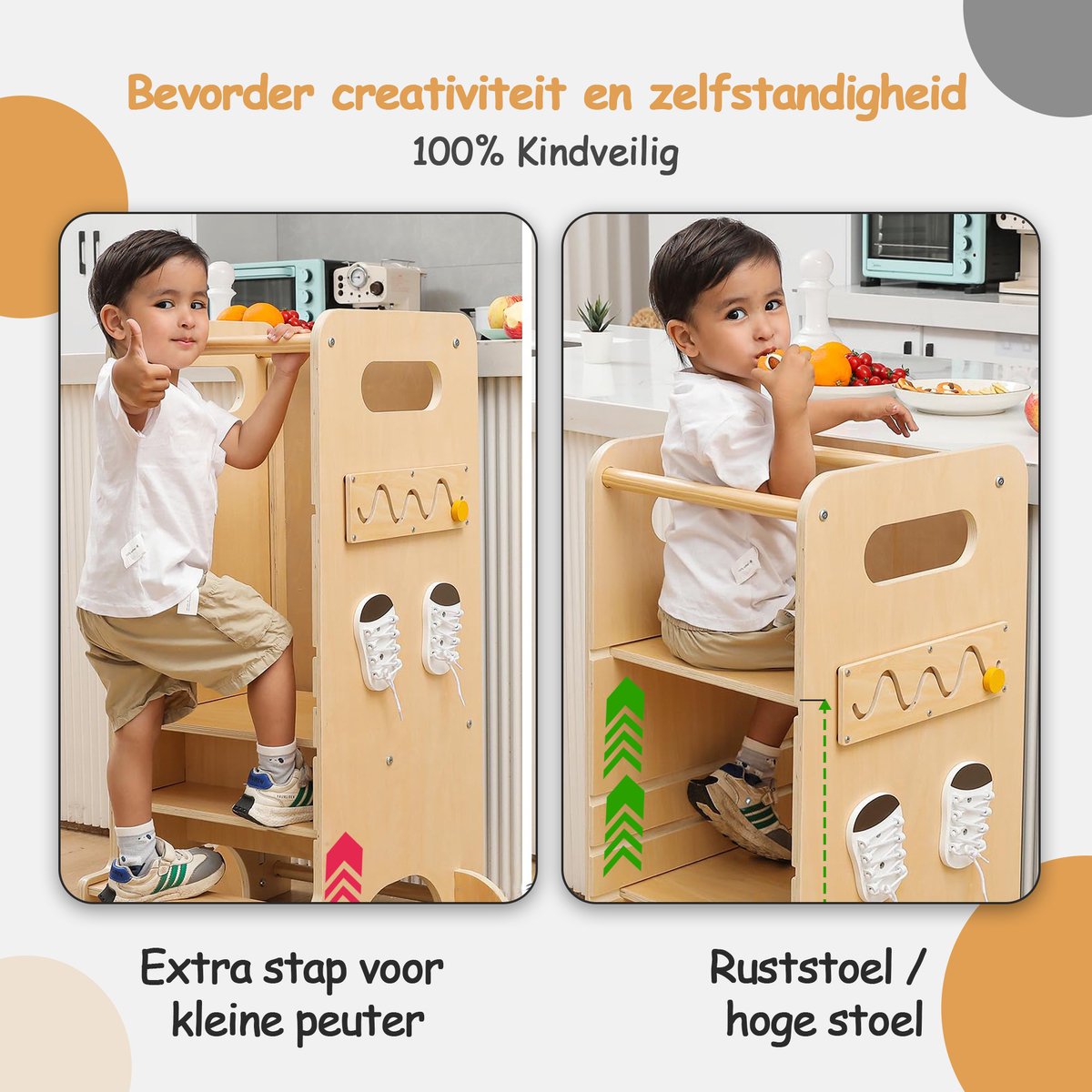 Veelzijdig: De leertoren kan gemakkelijk worden verwisseld tussen een keukenhulp, hoge stoel, glijbaan en Montessori-speelplek. Perfect voor jongens en meisjes van 12 maanden en ouder.