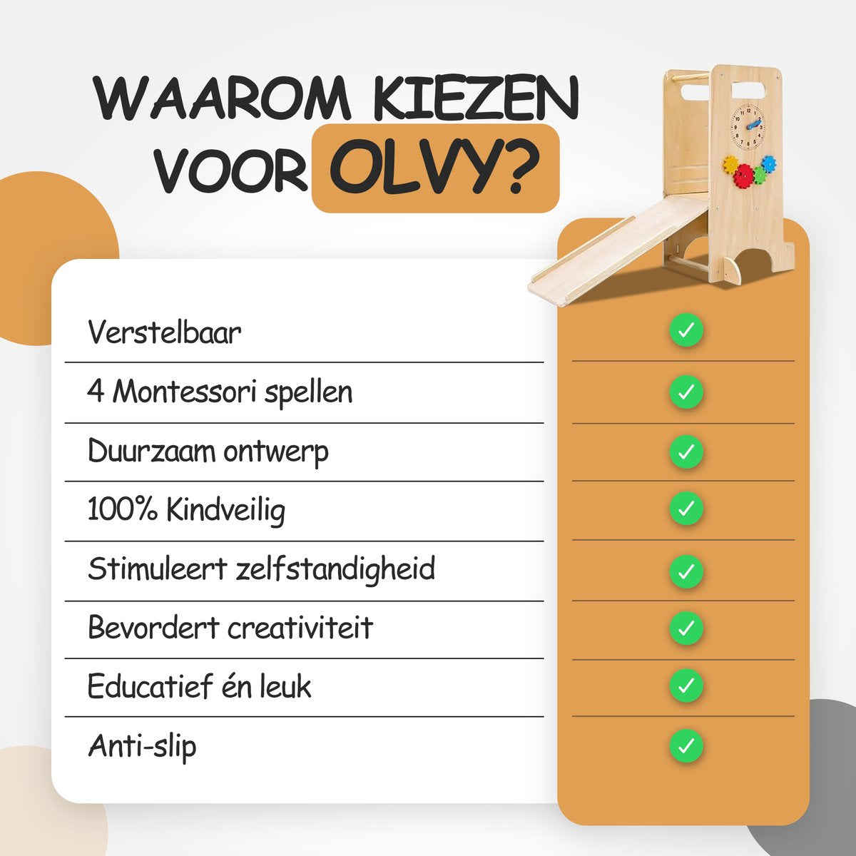 Met de Olvy leertoren geef je je kindje niet alleen een veilige plek om mee te doen, maar ook de ruimte om te leren, spelen en ontdekken. Of ze nu helpen in de keuken, hun creativiteit kwijt kunnen op het krijtbord of lekker willen glijden, deze multifunctionele toren groeit met ze mee.