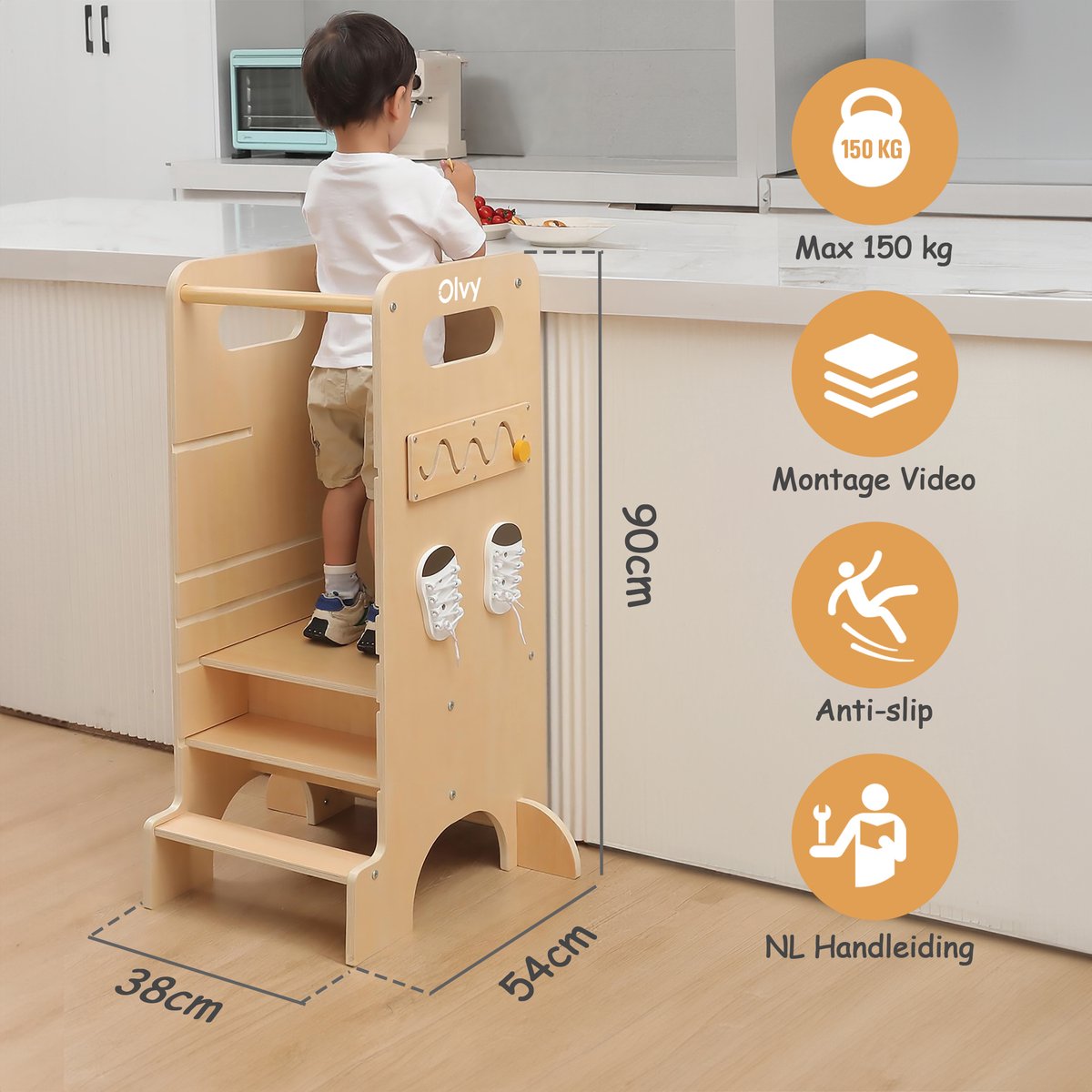 Laat je kleintje de wereld ontdekken met de 4-in-1 leertoren van Olvy. Deze slimme oplossing is ontworpen om je kind veilig en actief te betrekken bij dagelijkse activiteiten, terwijl jij geniet van gemoedsrust en extra ruimte in huis. De leertoren kan gemakkelijk worden veranderd van een keukenhulp naar een hoge stoel, een glijbaan of een Montessori-speelplek met een krijtbord, klok, schoenveters én nog meer. Het is de ideale manier om je peuter bezig te houden met leerzame en leuke activiteiten.