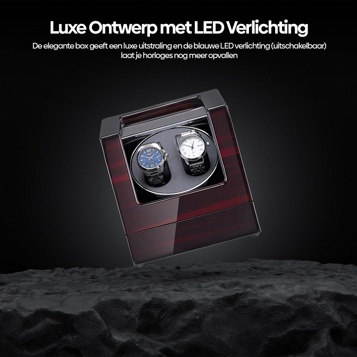 De watchwinder is gemaakt van hoogwaardig MDF en is voorzien van een organisch acrylglas venster wat stof en vocht buiten houdt. De elegante box geeft een luxe uitstraling en de blauwe led verlichting (kan uitgeschakeld worden) zorgt ervoor dat jouw horloges nog mooier tot zijn recht komen. De kussens in het midden zijn verstelbaar en geschikt voor horloges van verschillende afmetingen.