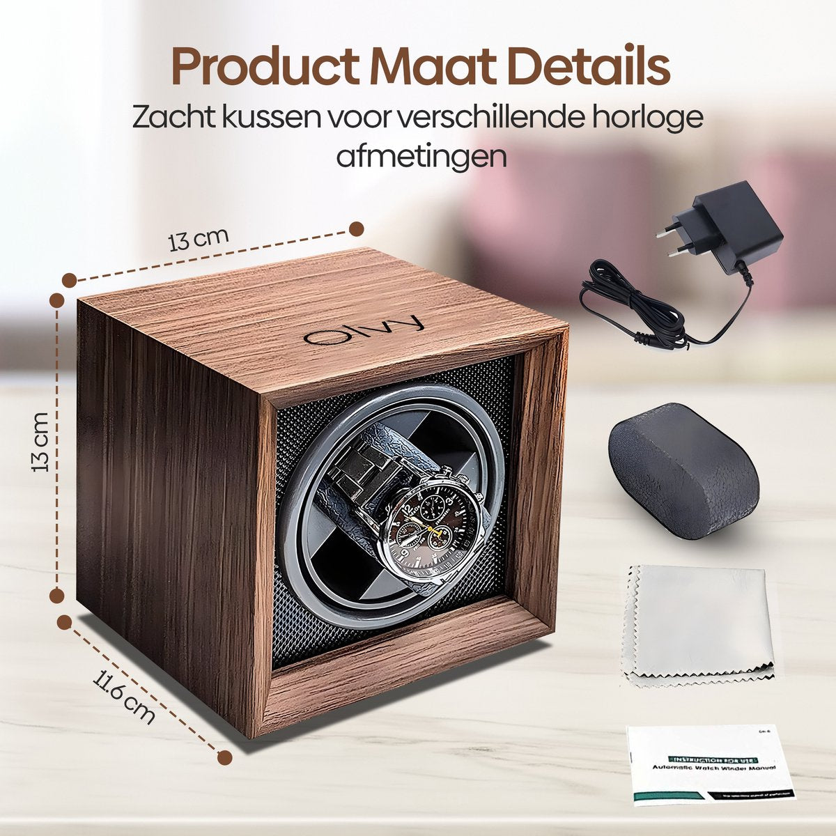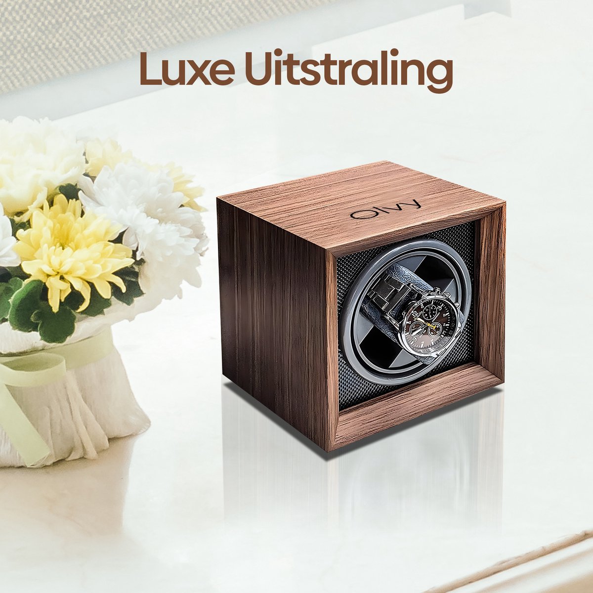 De watchwinder is gemaakt uit hoogwaardig zwart notenhout. Het retro-geïnspireerde ontwerp voegt een vleugje elegantie toe aan jouw stijl. De watchwinder heeft een anti-magnetisch ontwerp en een verfijnde uitstraling dankzij de houten afwerking en leren bekleding. Het waterafstotende hout maakt het mogelijk om de watchwinder met water schoon te maken. Er is bewust geen deksel geplaatst op de watchwinder om botsingen tussen het horloge en de deksel tijdens het opwinden te voorkomen.