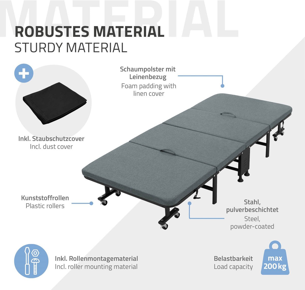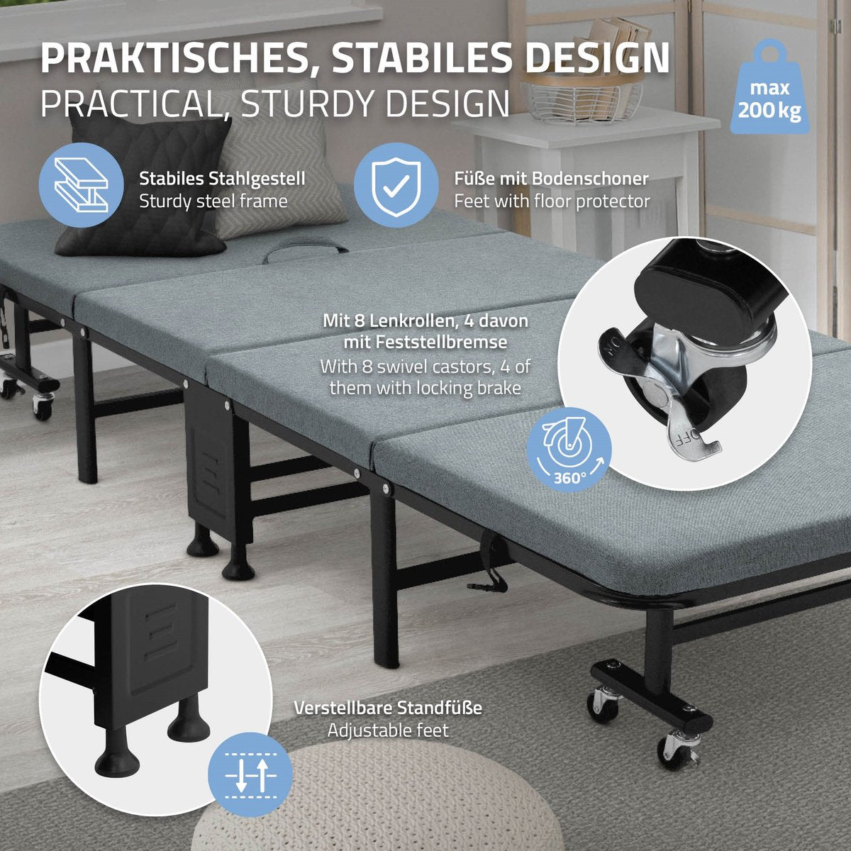 Ben je op zoek naar een praktische en comfortabele oplossing voor gasten? Dan is dit opklapbare logeerbed van 80 x 190 cm echt iets voor jou! Het is snel klaar voor gebruik omdat de gestoffeerde elementen al vastzitten en kunnen worden opgevouwen om ruimte te besparen. De kliksluitingen houden het bed stevig op zijn plaats wanneer het gesloten is. Dankzij het stevige stalen frame en in totaal 8 wielen (waarvan 4 met blokkeerrem) kun je het gemakkelijk vervoeren en veilig parkeren. Een passende hoes voor de opgevouwen toestand wordt meegeleverd - zo blijft het bed ook beschermd als het langere tijd wordt opgeborgen.
