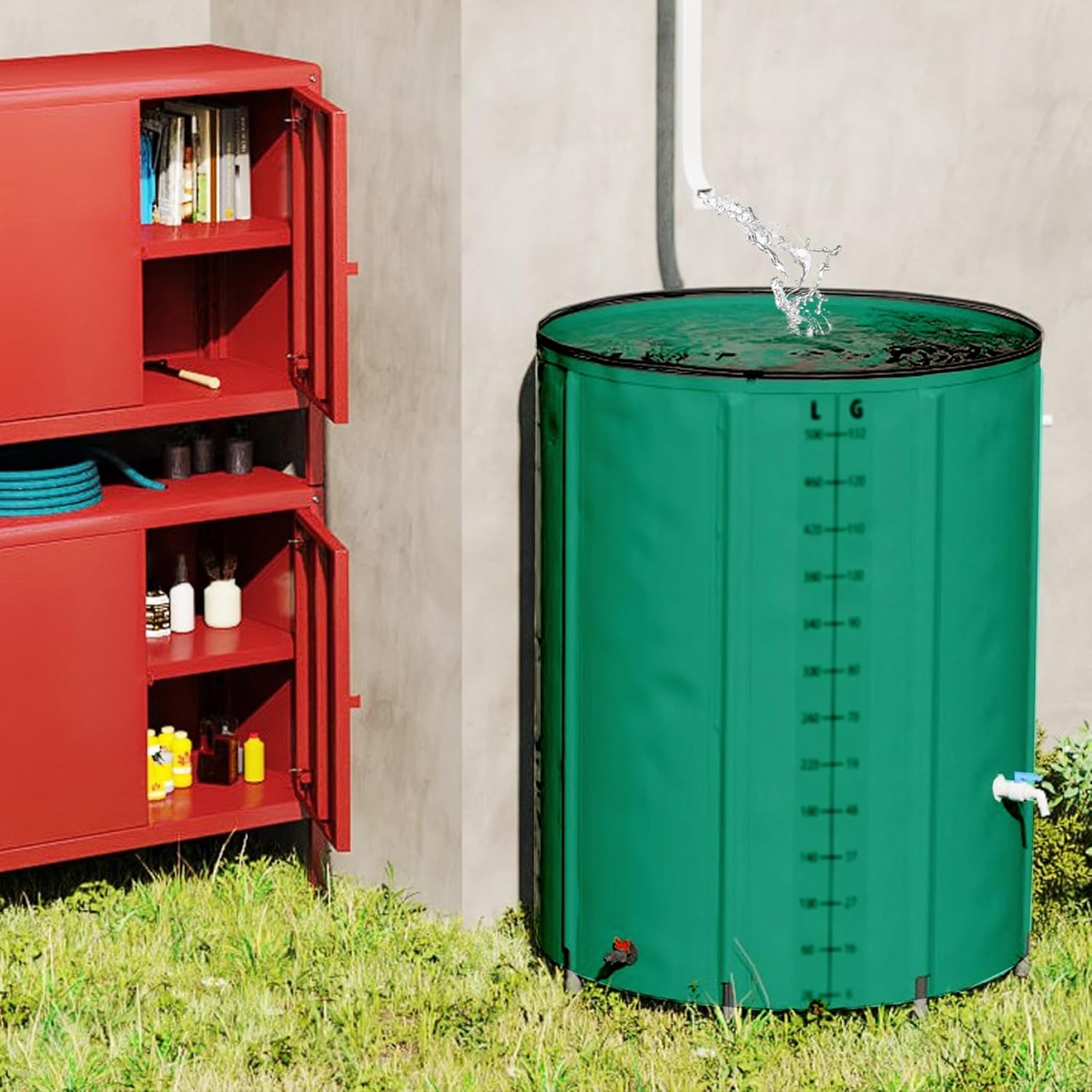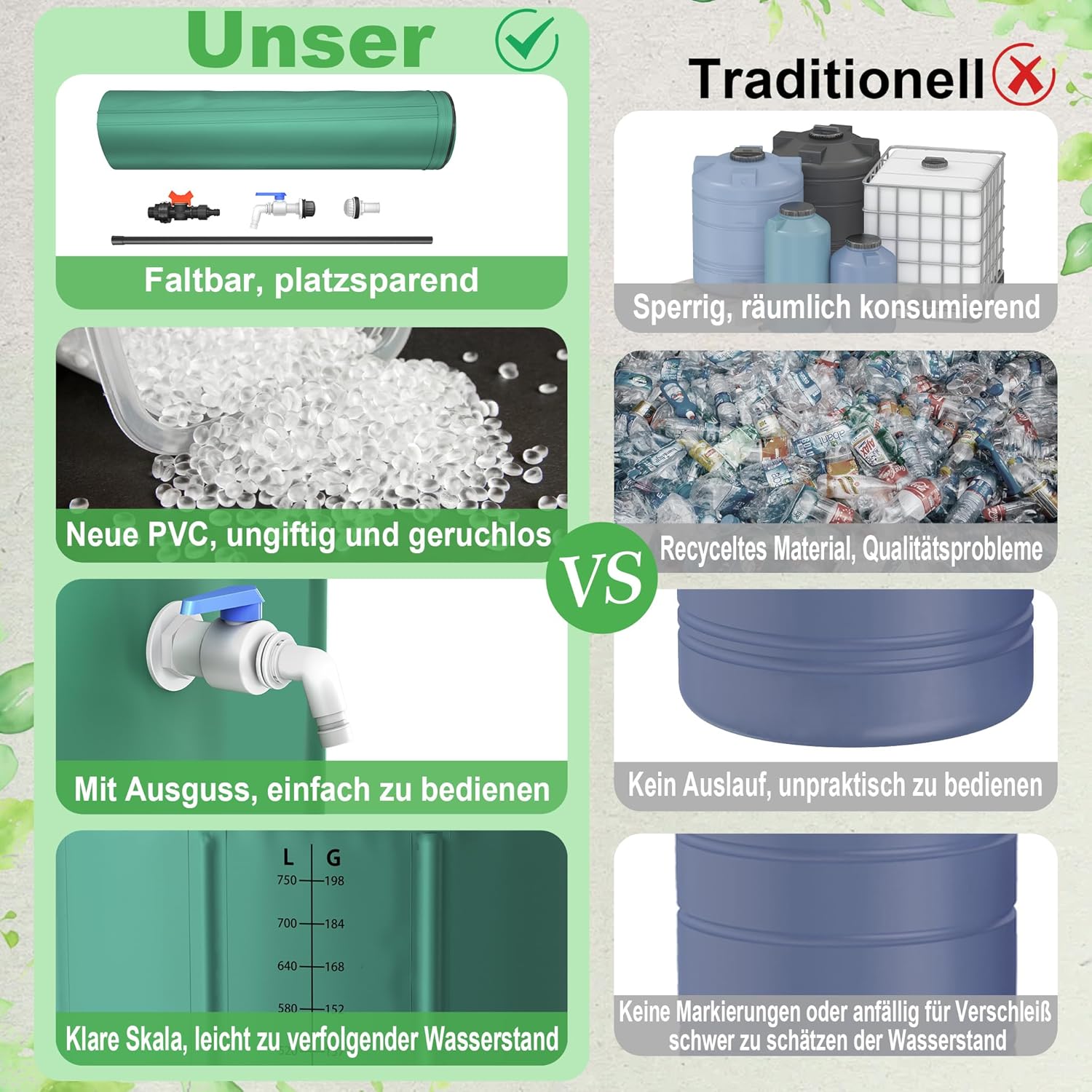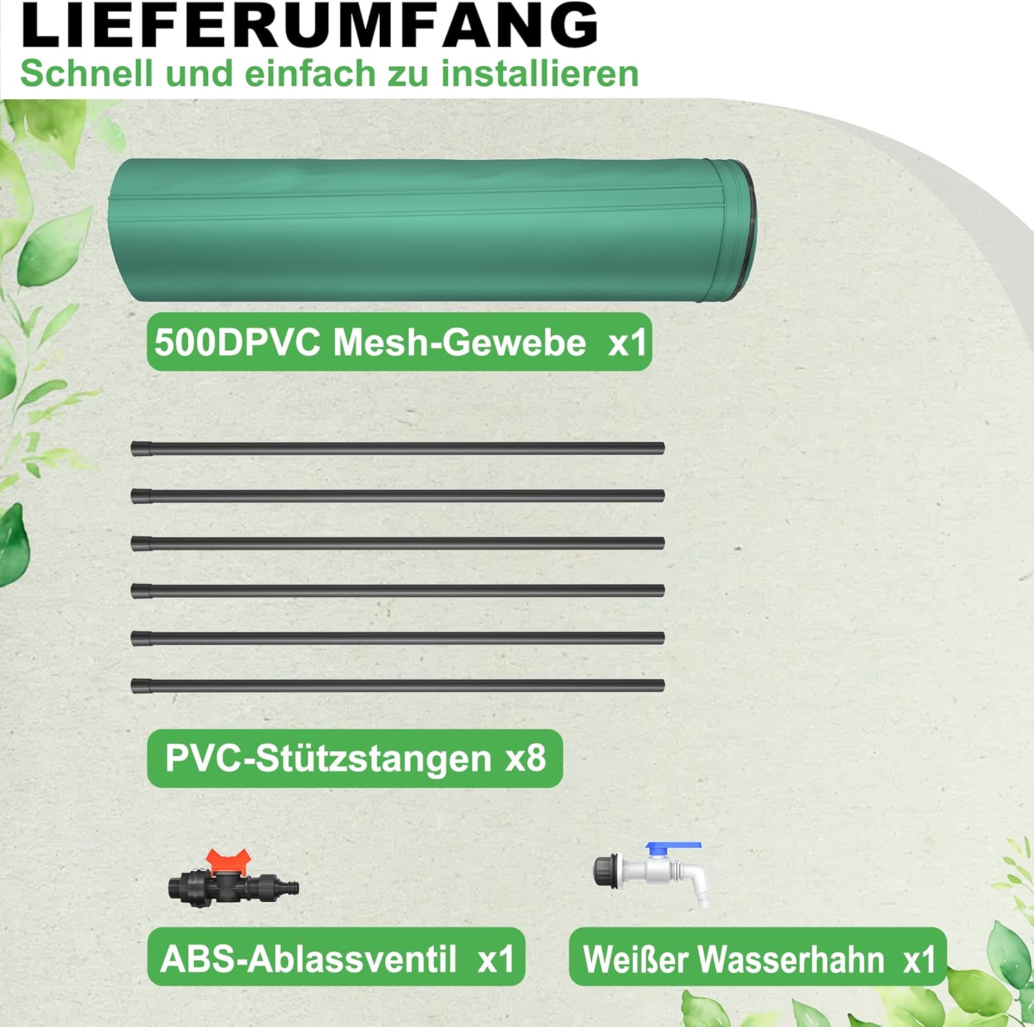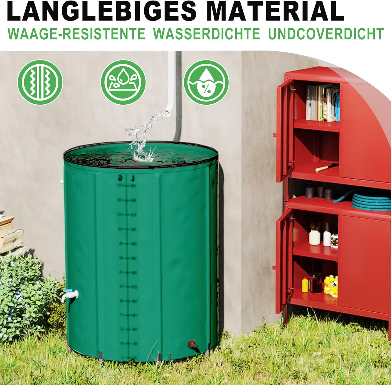 Met onze regenwatertank verzekert u zich niet alleen van een betrouwbare watervoorziening voor uw tuin, maar investeert u ook in een duurzame toekomst. Vang de regen op en benut de onuitputtelijke kracht van de natuur om uw planten te besproeien en uw waterverbruik te verminderen. Ons innovatieve ontwerp en nauwkeurige meetsysteem maken het eenvoudig om het waterpeil te controleren en hulpbronnen te besparen. Ontdek het gemak van milieubescherming en zet een stap naar een groenere wereld!