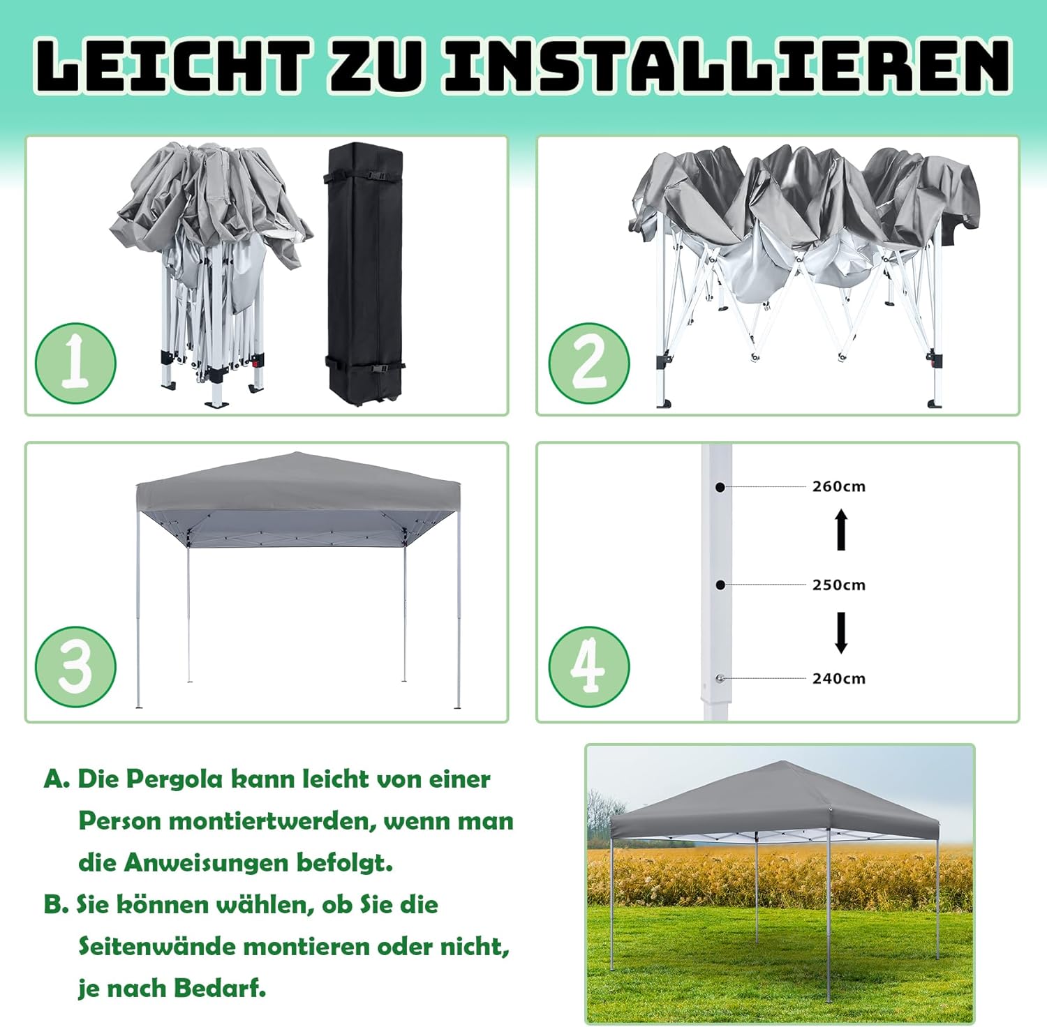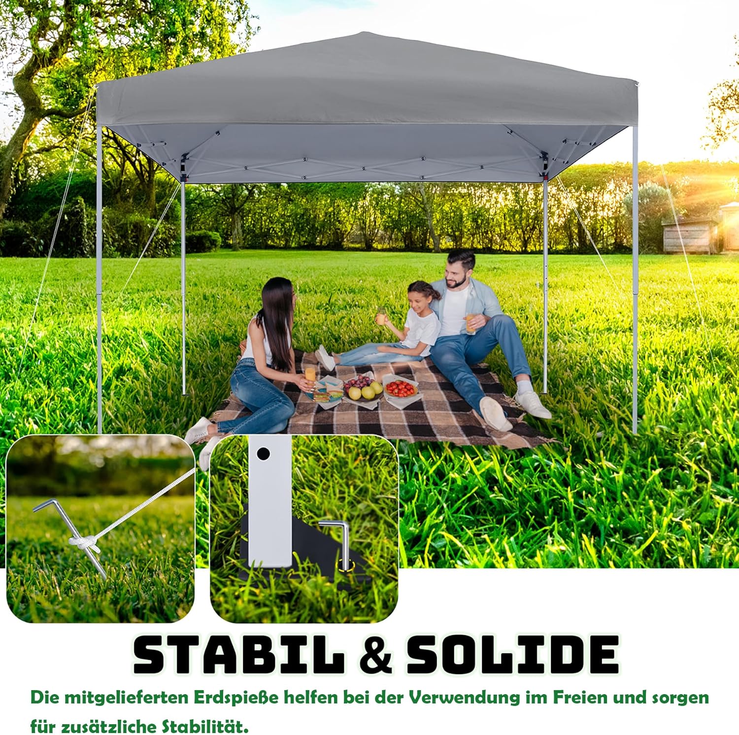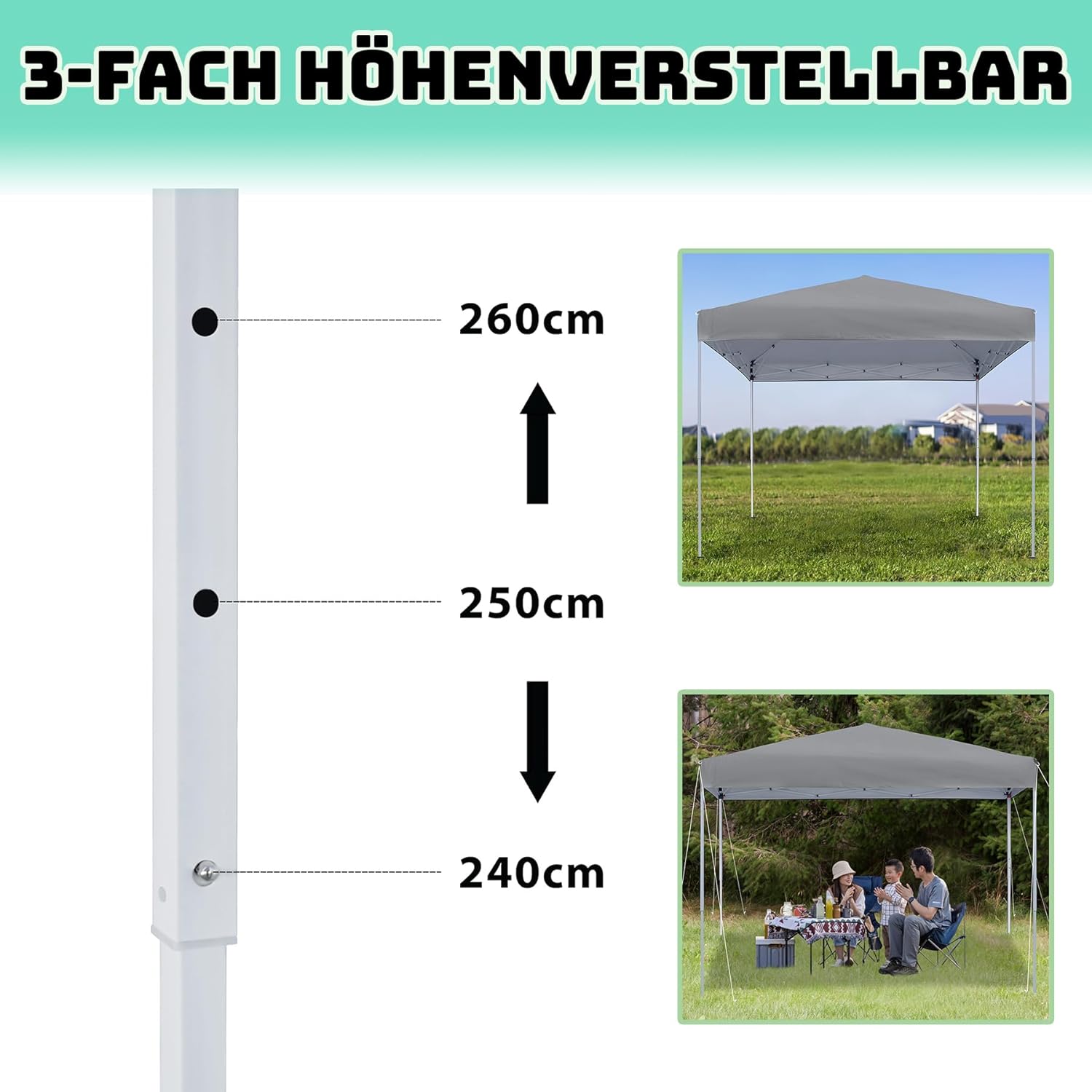 Breed toepassingsgebied: de drie in hoogte verstelbare tuinpaviljoens zijn geschikt voor een groot aantal gelegenheden, zoals kamperen, feesten, barbecuefeesten, rommelmarktstanden, sportactiviteiten in de open lucht en schoolevenementen, en voldoen aan je verschillende behoeften.
