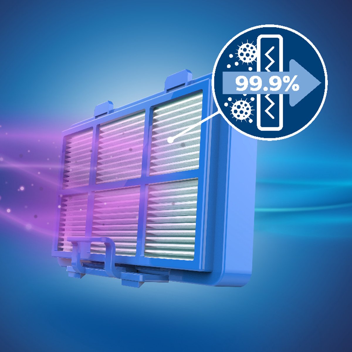 Het Clean Air-filtersysteem vangt 99,9% van fijnstof op, waaronder pollen, haar van huisdieren en huisstofmijt, en is ideaal voor mensen met een allergie en in het algemeen voor mensen die een hygiënischere omgeving wensen. Als allergievriendelijk gecertificeerd door ECARF.