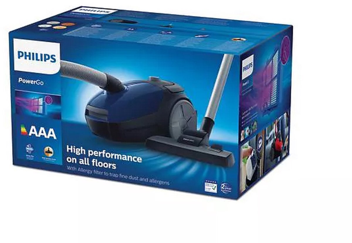 De Philips PowerGo-stofzuiger heeft een efficiente motor en maakt perfect schoon. De stofzuiger houdt de lucht schoon in uw huis met het allergiefilter systeem dat 99,9% van alle schadelijke deeltjes opvangt.