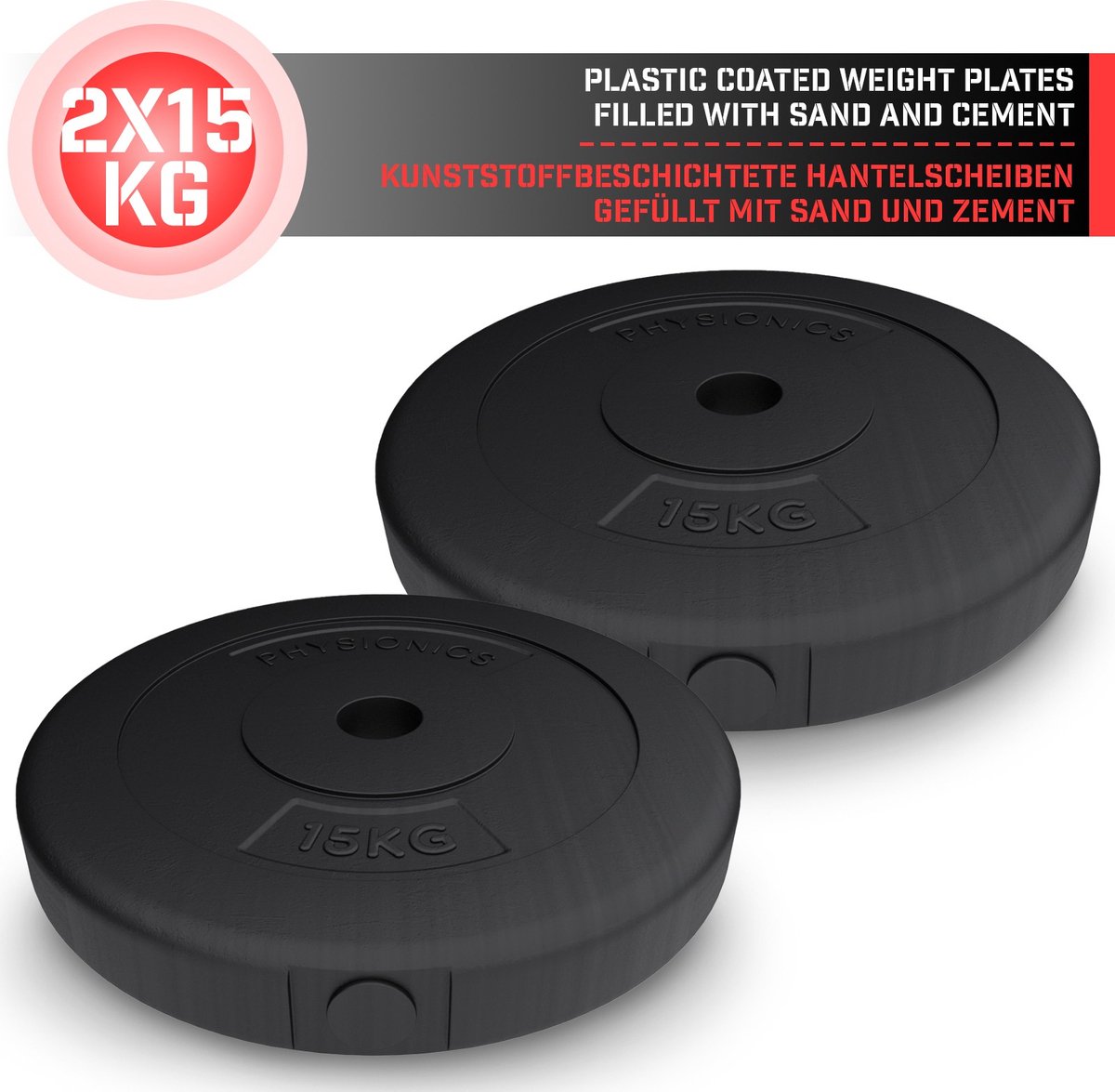 De Physionics halterschijven van 2 x 15 kg bieden een effectieve en praktische manier om jouw krachttraining te intensiveren. Dankzij de robuuste kunststof coating zijn de schijven vloervriendelijk, geluidsarm en duurzaam in gebruik. Met een gatdiameter van 31 mm passen ze op alle standaard halterstangen van 30 mm. Perfect voor zowel krachtopbouw als hersteltraining – en geschikt voor dagelijks gebruik in je eigen trainingsruimte.