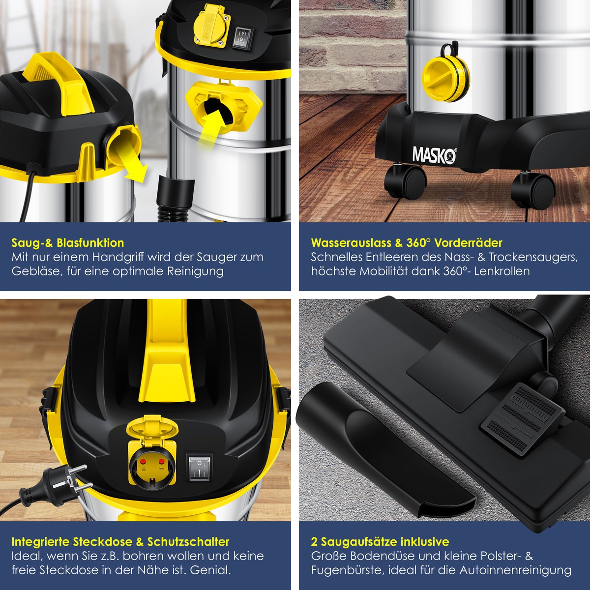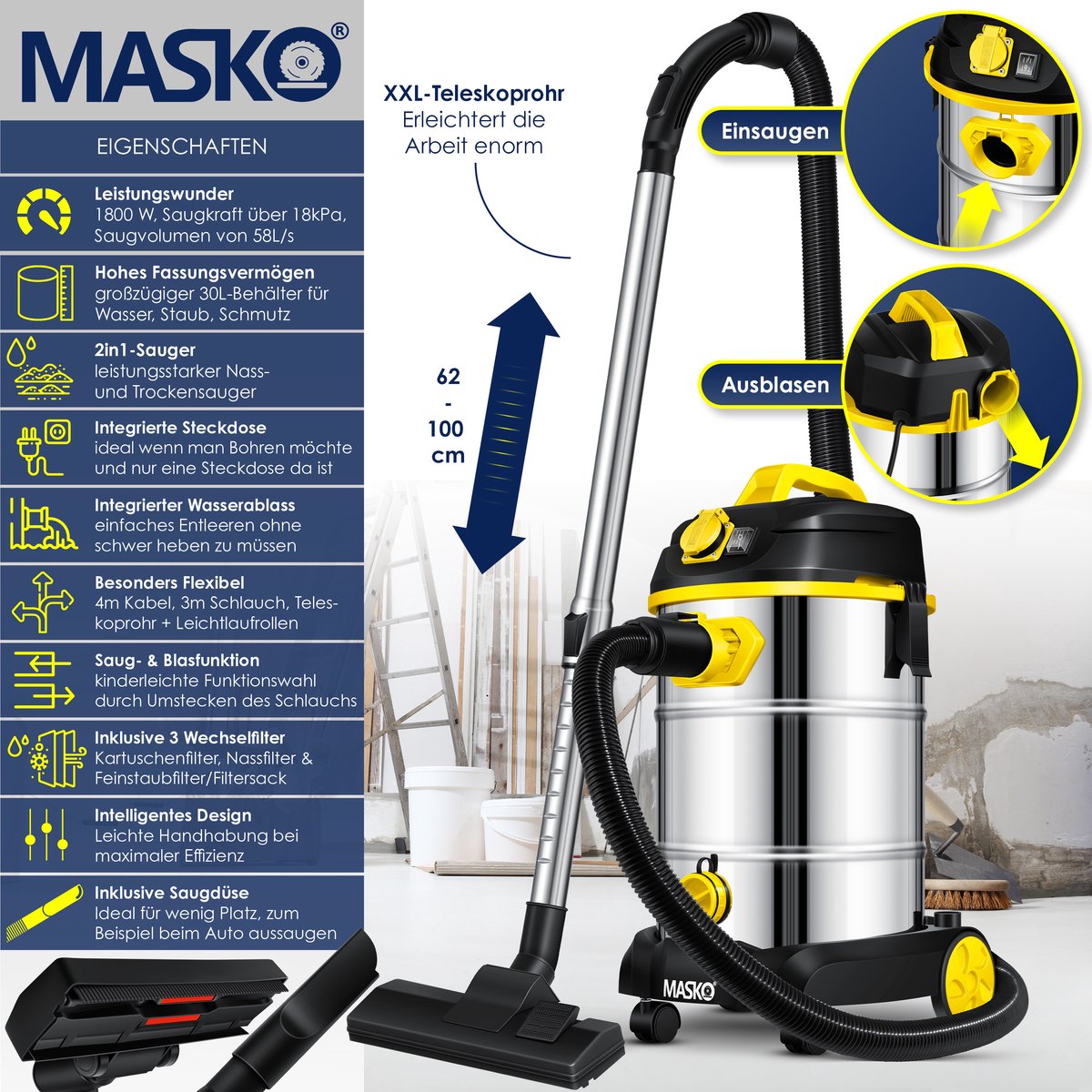 MASKO industriële stofzuiger, krachtig 1800W met een zuigkracht van 18 kPa, geïntegreerde blaasfunctie, met waterafvoer voor snel legen, waterbeschermde aan/uit schakelaar - autostop bij volle tank, Incl. verwisselbaar filter
