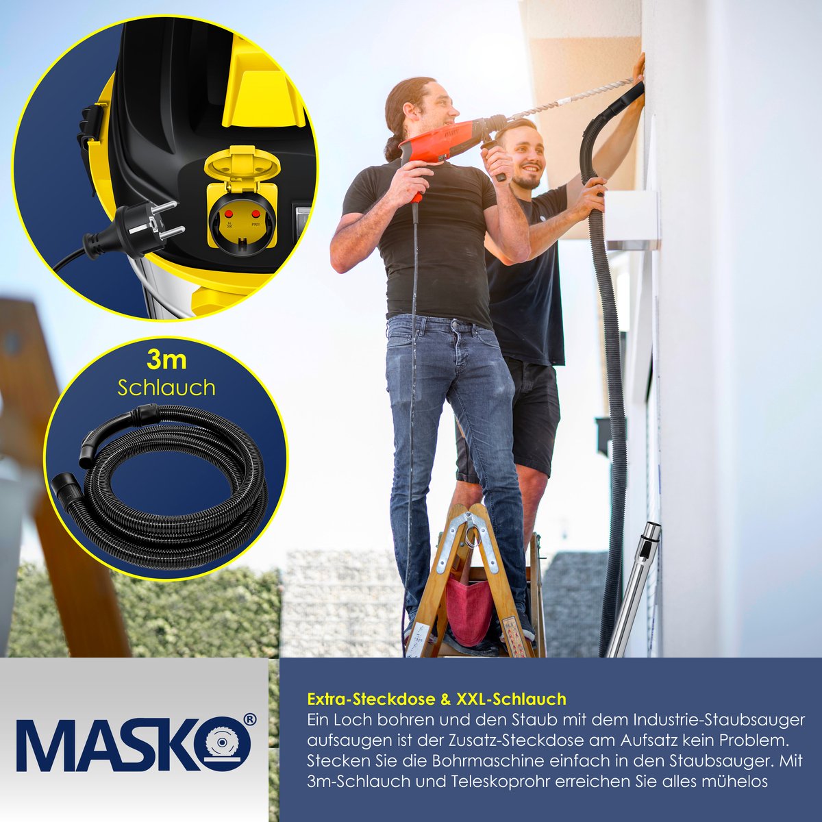 GEÏNTEGREERDE STROOMTOEVOER: Een gat boren zonder stof te produceren is geen probleem met de industriële stofzuiger, want met het geïntegreerde stopcontact is de volgende stroomaansluiting altijd binnen handbereik. Met de slang van 3 m, het snoer van 4 m en de telescopische buis kun je echt elk gebied moeiteloos bereiken.