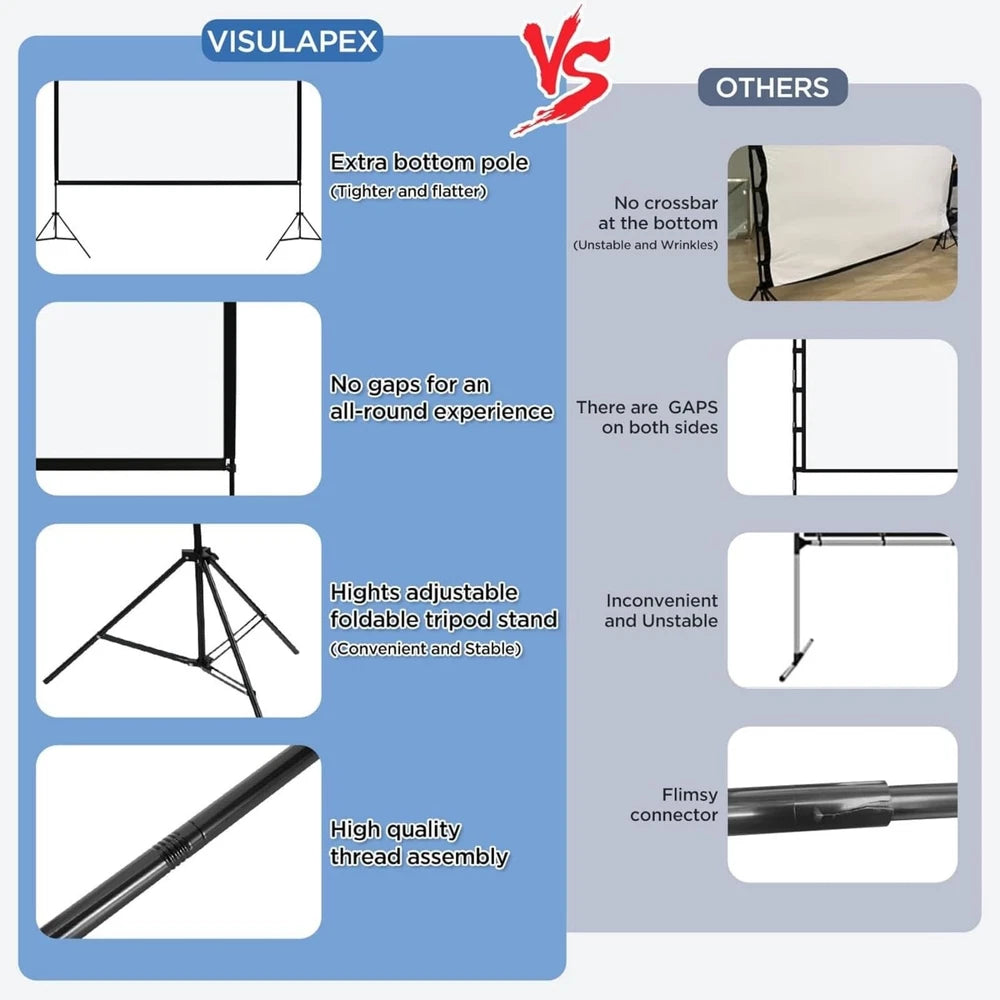 Kreukvrij en gemakkelijk schoon te maken: Het 120 inch projectiescherm voor buiten is gemaakt van hoogwaardig, dikker polyester melkzijde, wat de duurzaamheid verhoogt en het mogelijk maakt om het met water af te wassen zonder dat u zich zorgen hoeft te maken over kreukels. Het projectiescherm met standaard heeft een volledig omwikkeld ontwerp en een volledig vierkante structuur, waardoor het beeld compacter en platter is, waardoor vervelende kreukels of krullen op filmschermen verleden tijd zijn.