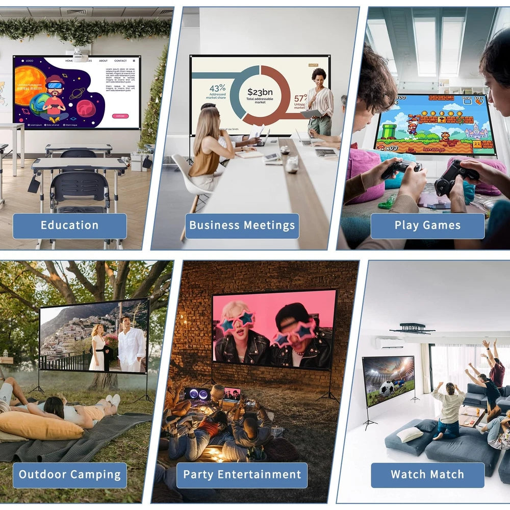 Opvouwbaar, draagbaar, duurzaam en stabiel statief: Het buitenprojectiescherm met standaard is duurzaam en lichtgewicht, waardoor het bestand is tegen buigen, vervormen en breken. Het stabiele statief is perfect voor zowel binnen- als buitengebruik. Het projectiescherm voor buiten is voorzien van grondpennen en touwen, waardoor het stevig genoeg is voor buitengebruik en niet snel door de wind omver geblazen wordt.