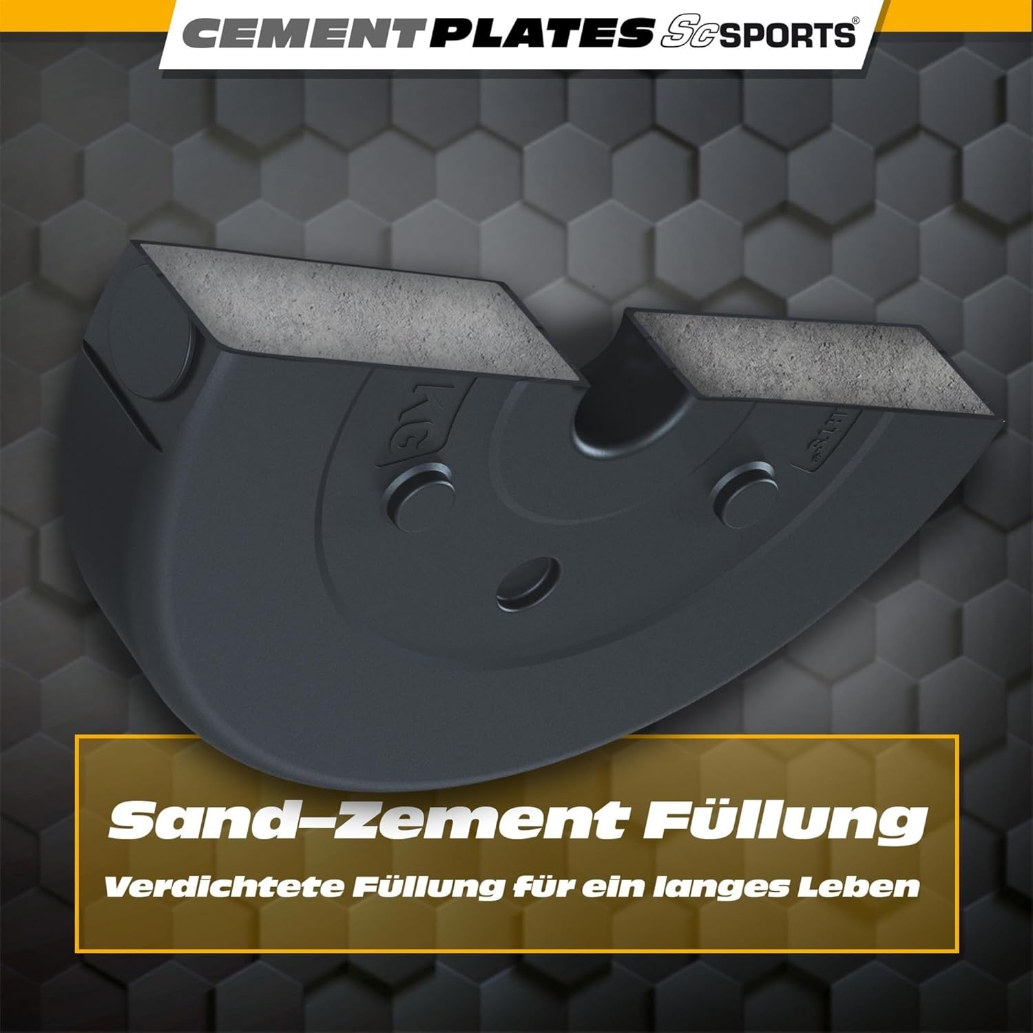 De halterschijven zijn gevuld met een sterk gecomprimeerd cementmengsel en worden volledig door meerdere lagen kunststof omsloten. Daardoor ontstaat aanzienlijk minder lawaai bij het neerleggen. In elkaar grijpende uitsparingen en noppen minimaliseren de rotatie van de schijven op de stang en de gewichten kunnen gemakkelijker van de grond worden opgenomen.
