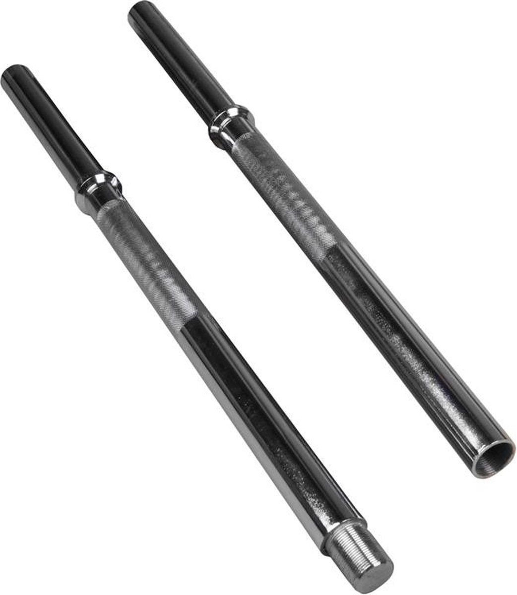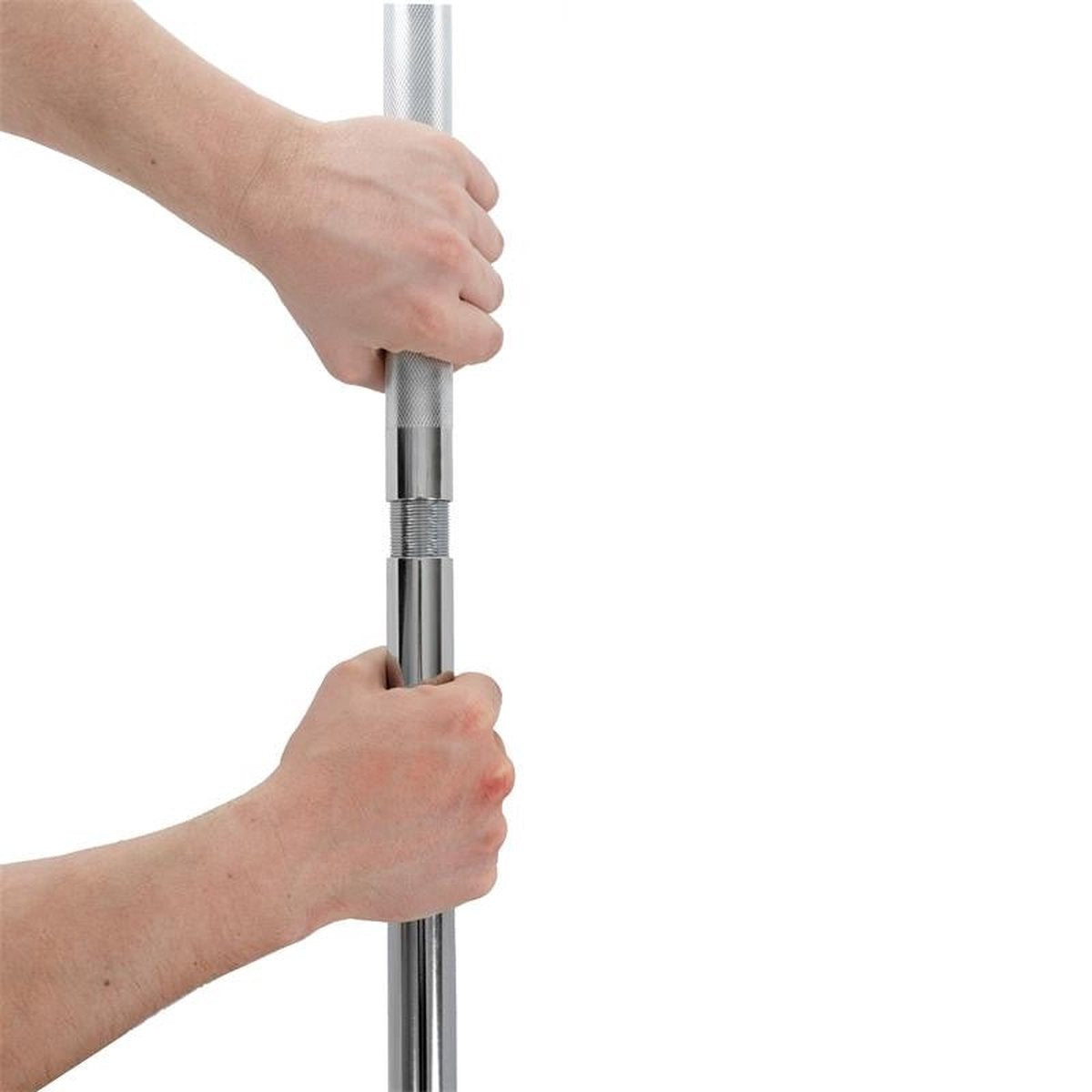 De 2-delige lange halterstang van verchroomd staal kan makkelijk uit elkaar worden gedraaid en daardoor makkelijker worden opgeborgen. Dankzij de geribbelde greepvlakken heb je tijdens je hele training goede grip.