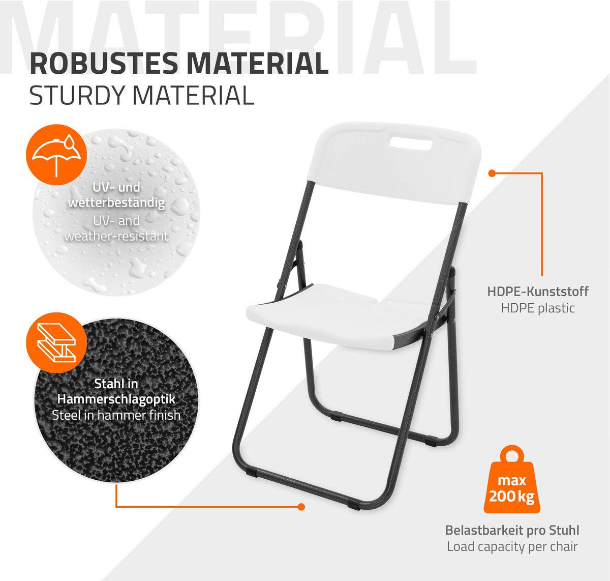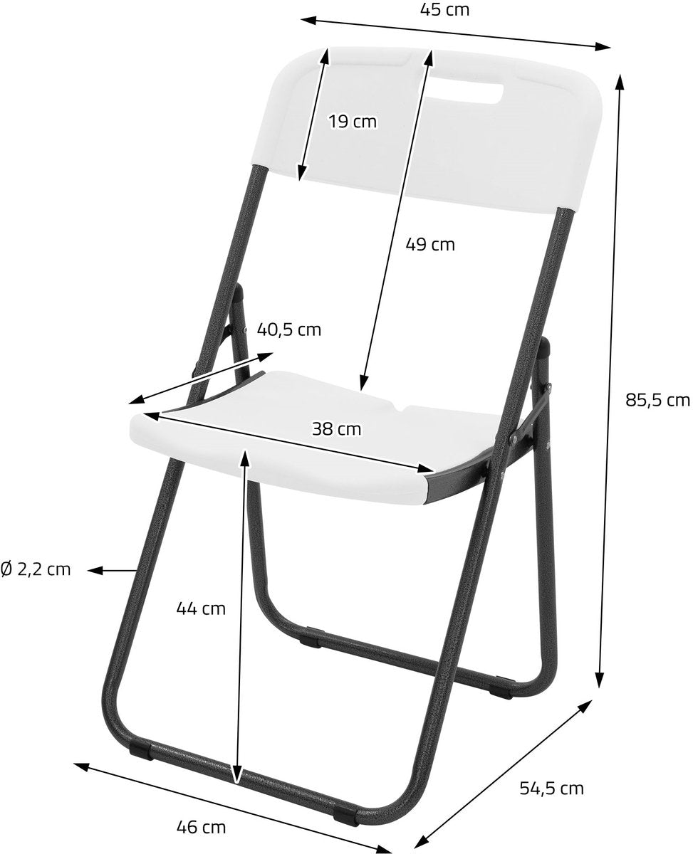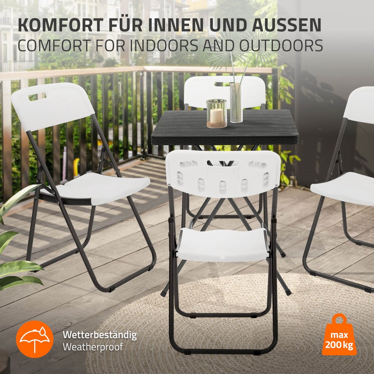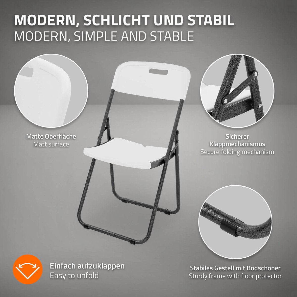 Ben je op zoek naar praktisch zitmeubilair dat nauwelijks ruimte inneemt in het dagelijks leven? Deze set van 4 klapstoelen is de ideale oplossing. Met een stevig stalen frame, witte zitting met matte afwerking en ruimtebesparende vouwfunctie ben je perfect uitgerust - voor binnen en buiten.