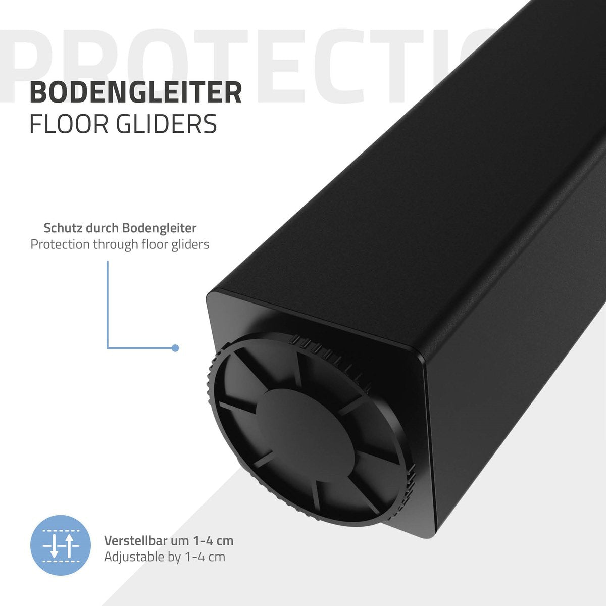 Dankzij de 4 mm dikke montageplaten kunnen de poten stevig onder bijna elk tafelblad worden geschroefd. De geïntegreerde, in hoogte verstelbare schroefpoten compenseren op betrouwbare wijze ongelijkmatige vloeren en zorgen voor een stevige, wiebelvrije stand - of het nu op tegels, parket of beton is.