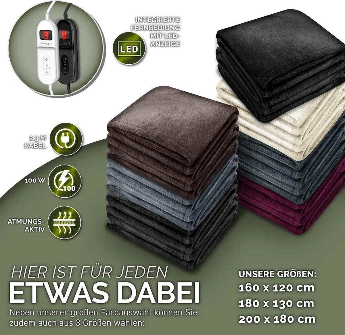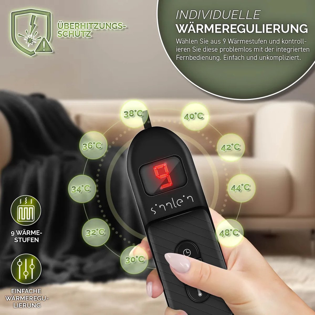 De deken heeft 9 instelbare temperatuurniveaus, automatische uitschakeling en een afneembare LED-regelaar waarmee je de temperatuur kunt instellen tussen 35 °C, 40 °C en 45 °C.