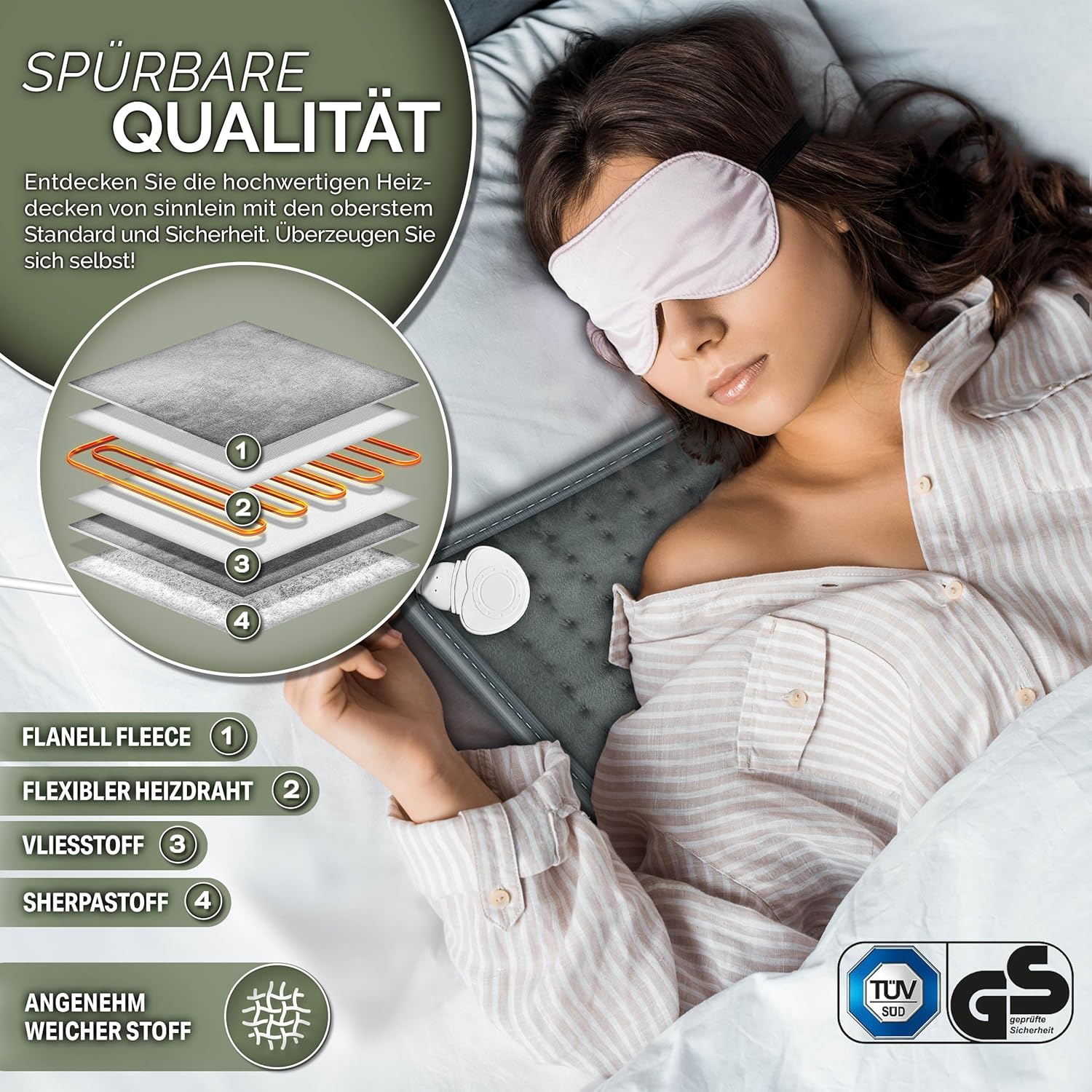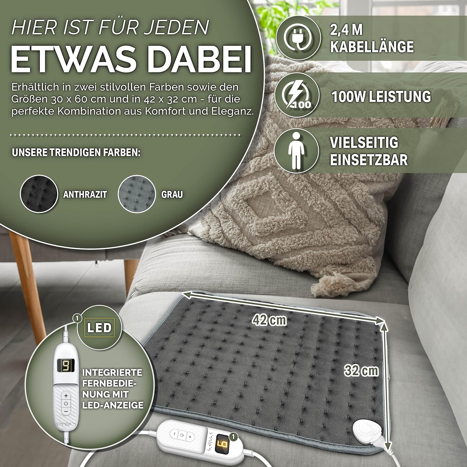 Voor iedereen – 6 temperaturen: het elektrische warmtekussen heeft 6 verschillende warmtestanden, een verlichte afstandsbediening en 100 W vermogen, die binnen 10 minuten tot de gewenste temperatuur opwarmen.