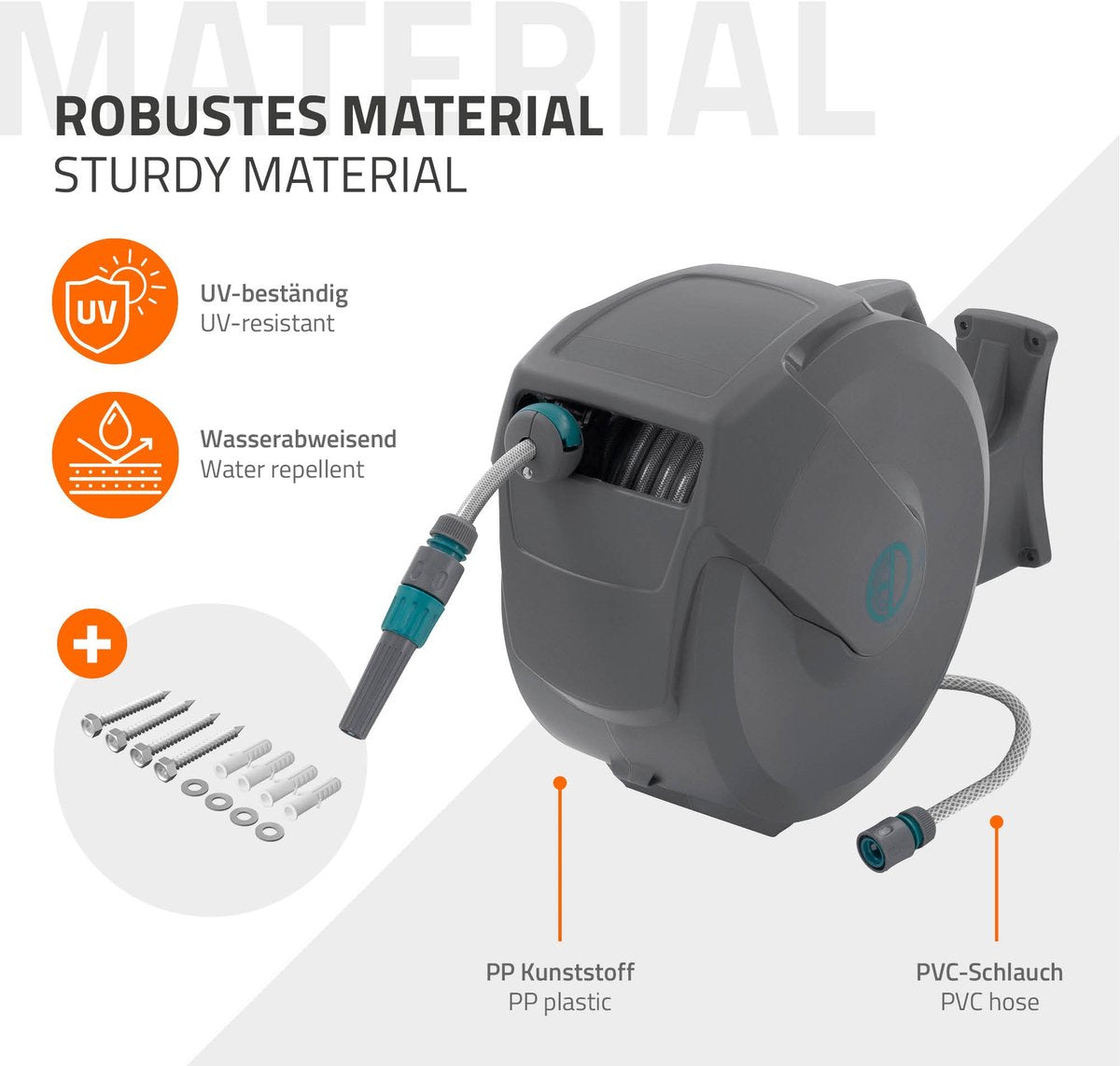 Met deze praktische slanghaspel behoort moeizaam oprollen tot het verleden. Het geïntegreerde veermechanisme rolt de slang van 30 meter automatisch en gelijkmatig op - schoon, veilig en netjes. Dankzij de vergrendelfunctie kan de slang op elke gewenste lengte worden gestopt. De beugel voor wandmontage zorgt voor ruimtebesparend en flexibel gebruik, waardoor de haspel ideaal is voor in de tuin of aan de muur van het huis. De robuuste behuizing en betrouwbare PVC slangkwaliteit garanderen een lange levensduur. Inclusief materiaal voor wandmontage en veelzijdige accessoires zoals snelkoppelingen, standaard sproeikop en een multifunctionele sproeikop met zeven sproeifuncties.