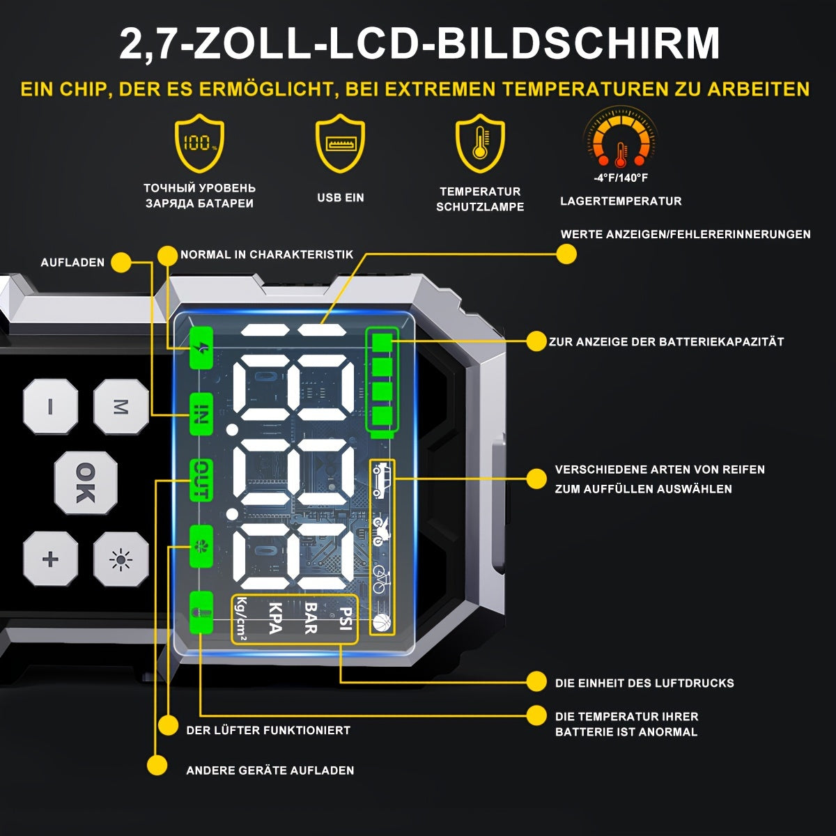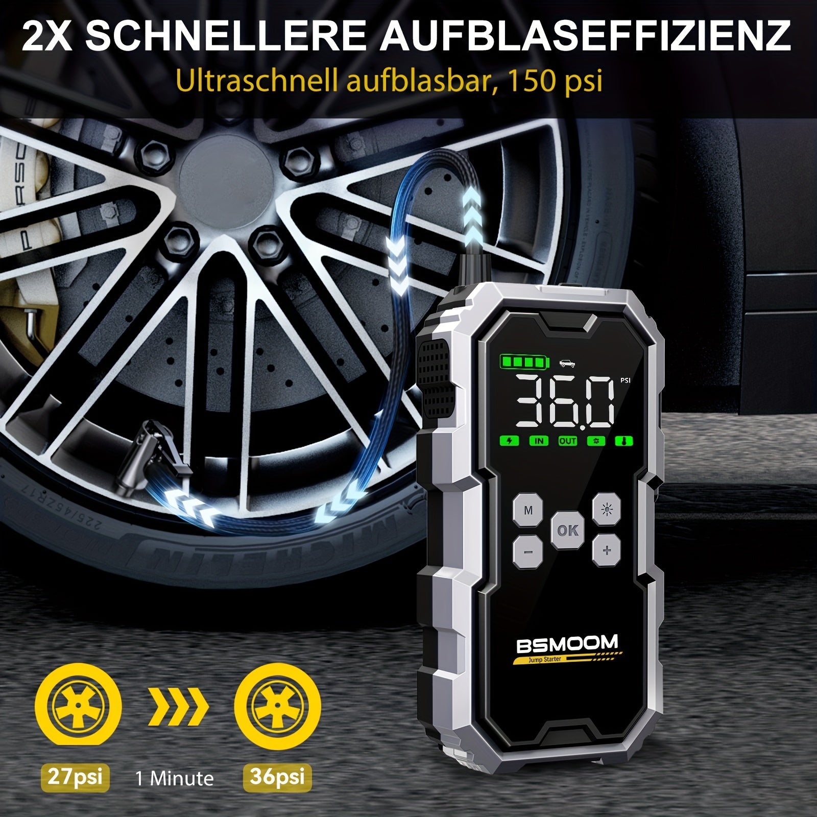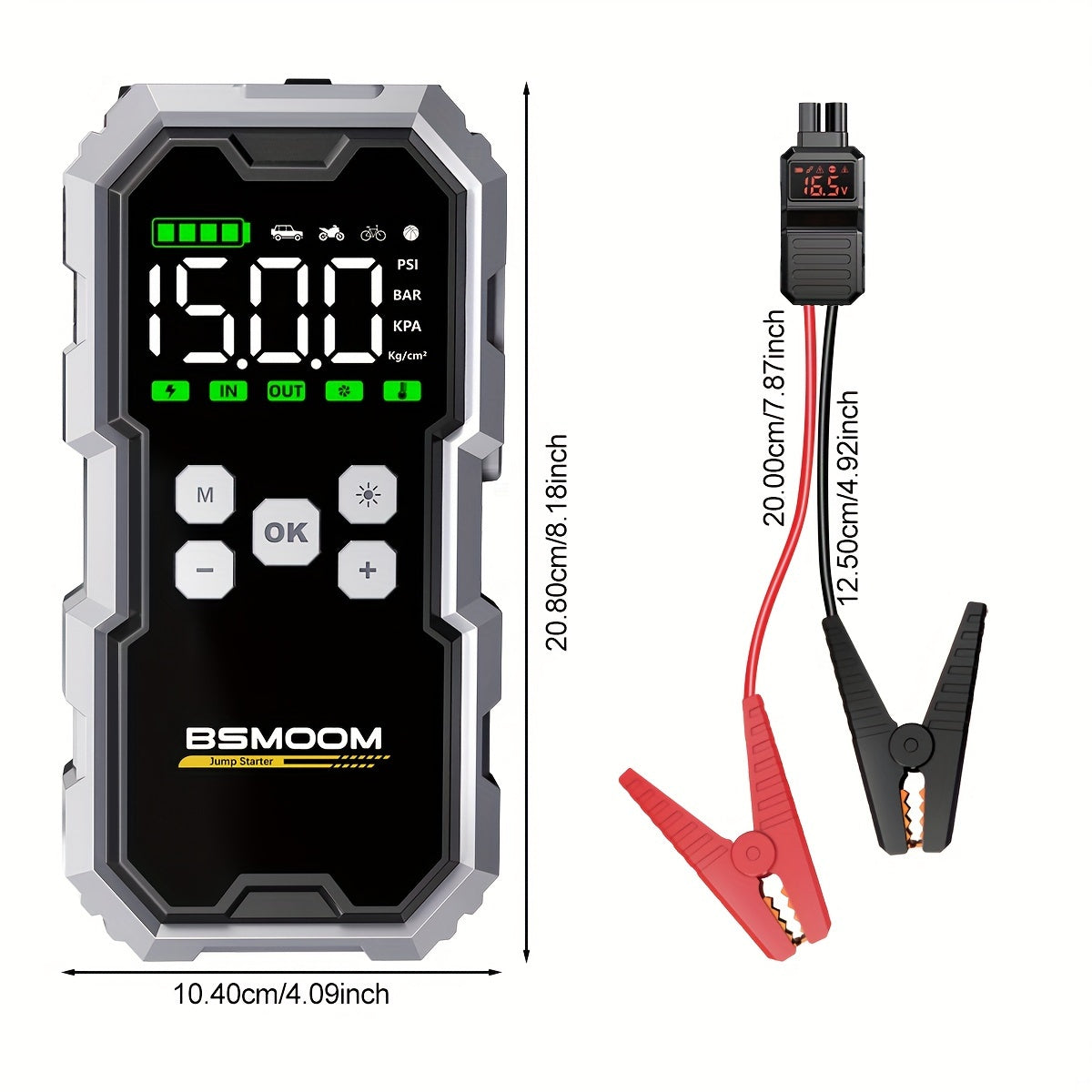 【SLIMME DIGITALE BANDENOPVULFUNCTIE】De BSMOOM starthulpaccu is voorzien van een LED-scherm en geavanceerde bandenspanningsdetectie, die cruciale informatie biedt zoals het batterijniveau, de opblaasmodus en de realtime bandenspanning. De 150 PSI-luchtcompressor ondersteunt vier eenheden (PSI, BAR, KPA, KG/CM) en pompt een normale autoband efficiënt op tot 20 PSI in ongeveer één minuut, wat hem gebruiksvriendelijk en zeer handig maakt.