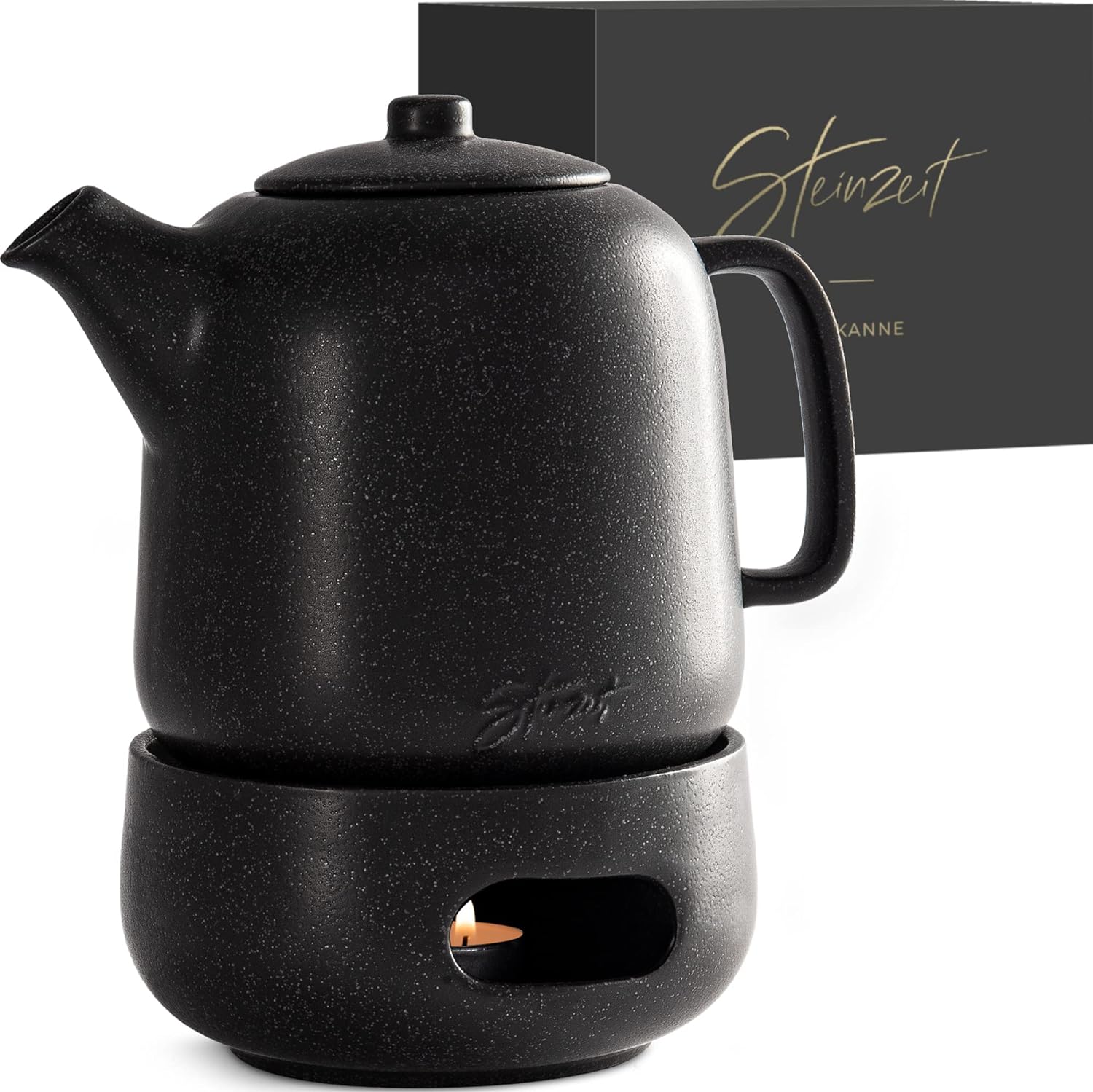 STEINZEIT Design theepot met stoofje, 1,3 liter, met zeefinzet van roestvrij 304 roestvrij staal, keramiek met uniek glazuur met zeef, uitneembaar, zwart