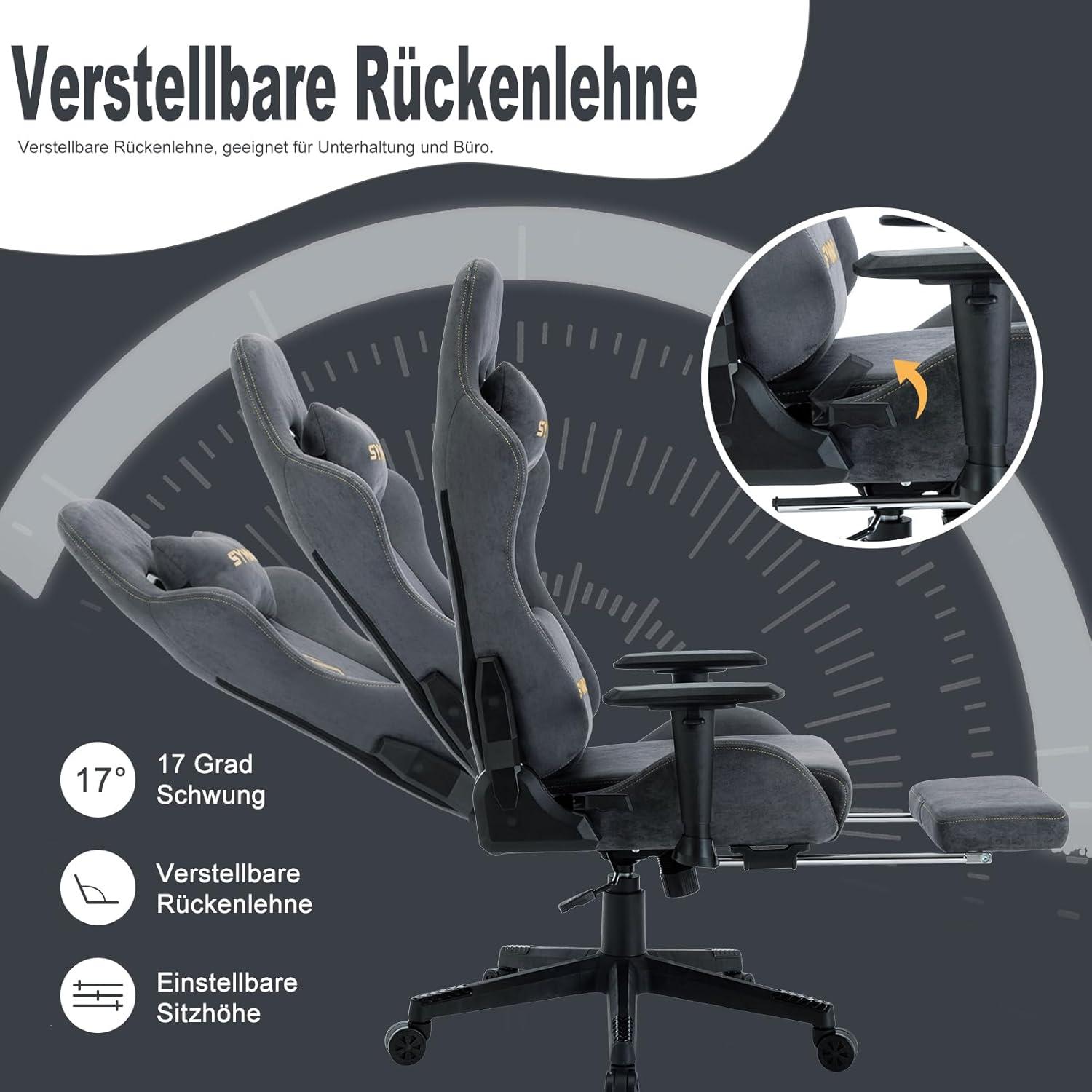 【Verstelbare gamingstoel】: de rugleuning kan van 90 ° tot 150 graden worden gekanteld, zodat je moeiteloos kunt schakelen tussen werk, gaming en ontspanning. De gasveer van klasse 3 maakt een individuele hoogteaanpassing mogelijk, zodat de stoel perfect bij je lichaamslengte past.