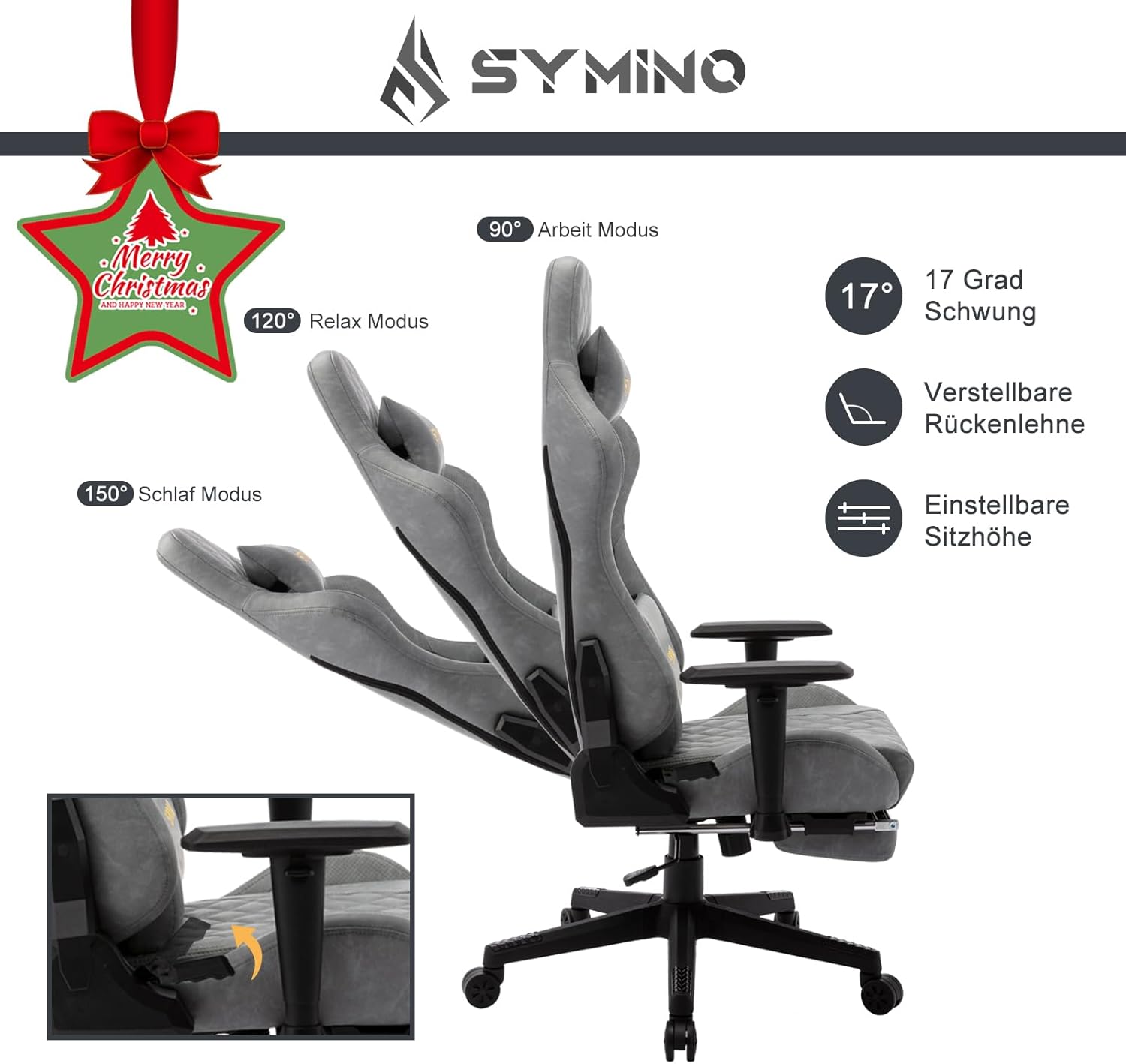 Het instelbare armleuningshoekbereik bedraagt 30 graden, de armleuningslengte bedraagt 26,5 cm, de breedte van de armleuning bedraagt 8,5 cm