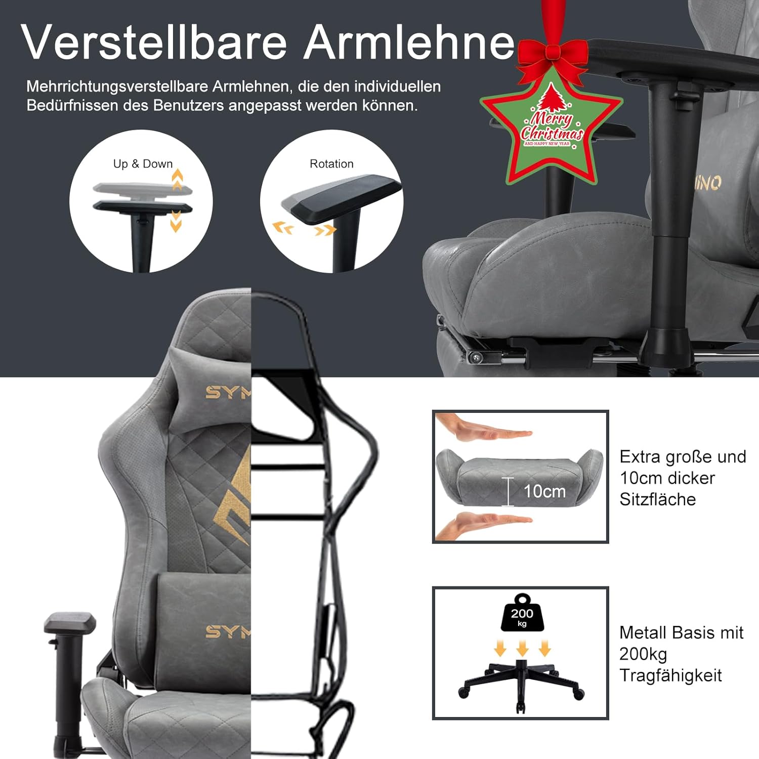 9 cm stoel in hoogte verstelbaar: verstelbaar hoofdkussen en massage-lendenkussen PU-leder gevoerde verstelbare armleuning (boven en onder/links en rechts)11 cm dik comfortabel zitkussen 360° zwenk90° liggen en 15° schommels intrekbare voetsteun, SGS- en BIFIMA-gecertificeerd