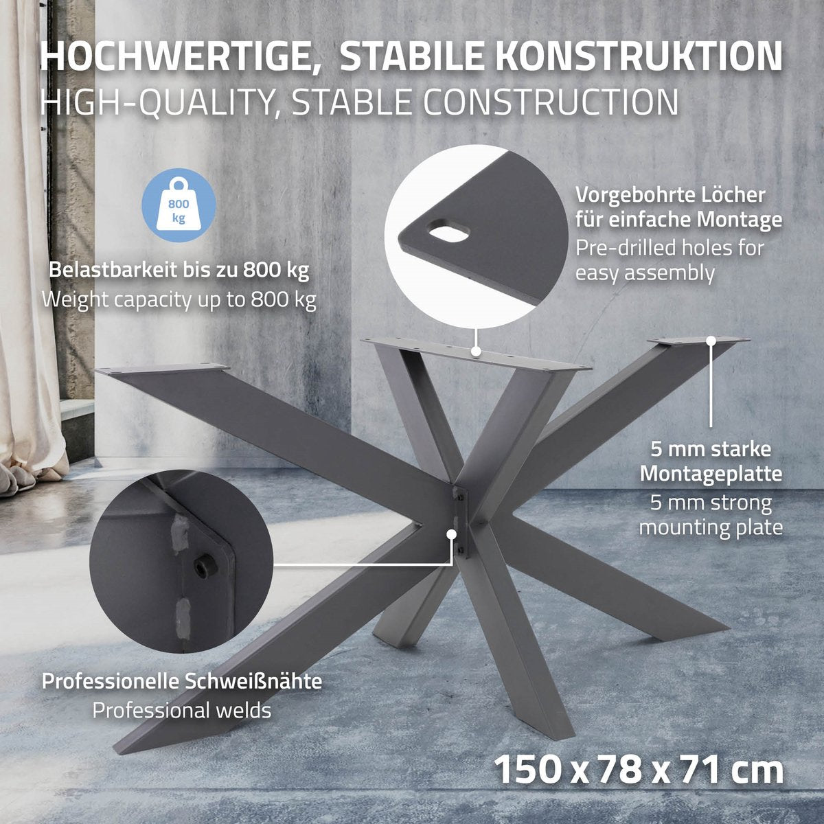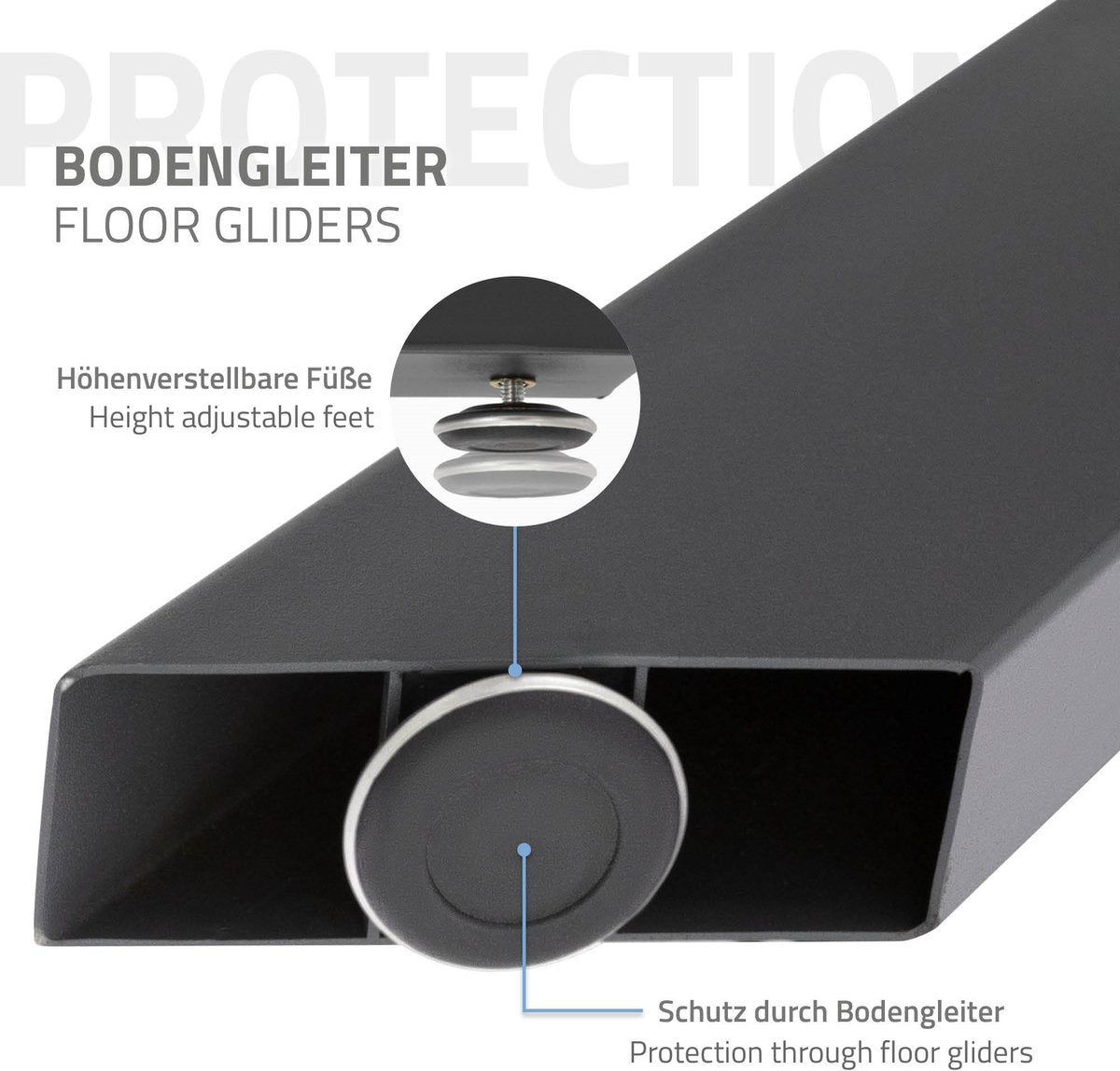 De hele constructie is niet alleen stabiel, maar ook zeer esthetisch. Onze tafelpoten zijn perfect voor tafelbladen van de meest uiteenlopende materialen, zoals hout, kunststof, steen, enz. en de bijgeleverde vloerbeschermer zorgt voor een veilige en krasvrije stand op de vloer. Voorgeboorde gaten in elke poot maken de montage gemakkelijker en handiger.