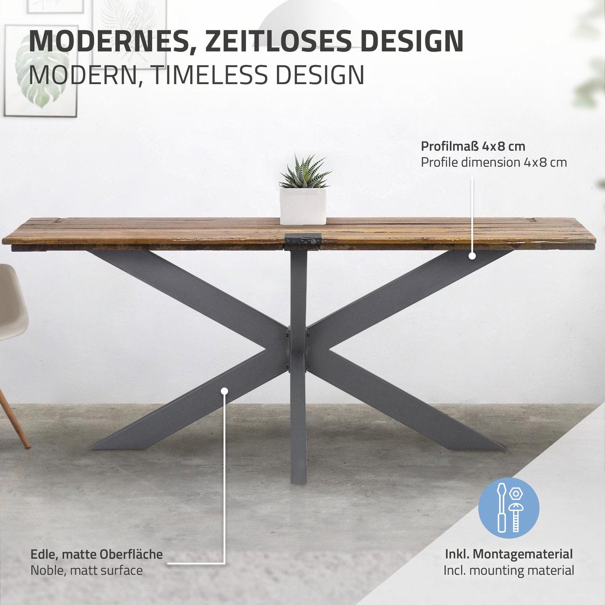 De trendy tafelpoten zijn ook geschikt voor uw moderne interieurinrichting. De stabiele, robuuste en trendy industriële look wordt benadrukt en dankzij het eenvoudige uiterlijk openen zich verschillende toepassingsgebieden. Dankzij dit designelement creëert u een frisse sfeer voor uw interieur. Zeer lichte maar toch stabiele constructie.