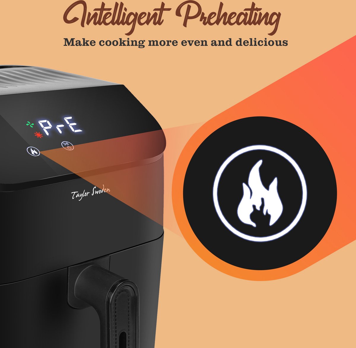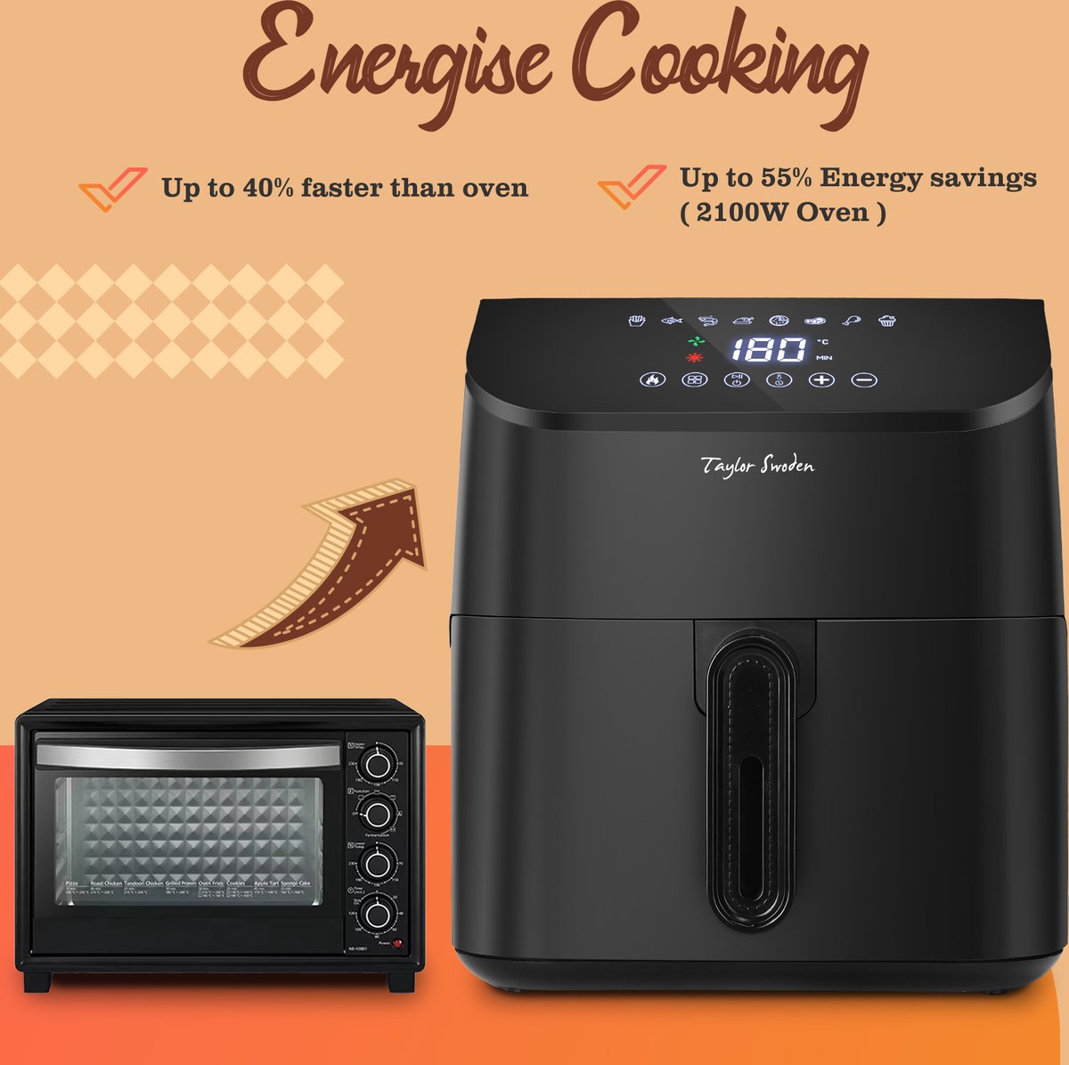 Met de Taylor Swoden Amy heteluchtfriteuse geniet je dankzij de 360 graden hete lucht circulatievan gezonde gerechten met een knapperige buitenkant en malse binnenkant. Dit model heeft een inhoud van 4.5 liter, waardoor je tot wel 700 gram friet in één keer bakt. Daarnaast is hij ook geschikt voor het bereiden van kip, snacks, rundvlees, vis, garnalen en taarten. Voorzien van een digitaal scherm, 8 vooraf ingestelde programma's is deze heteluchtfriteuse eenvoudig te bedienen met de touch-knoppen. Pas de temperatuur aan tussen de 80 en 200 graden en stel de timer in tussen de 1 tot 60 minuten, afhankelijk van het te bereiden gerecht.