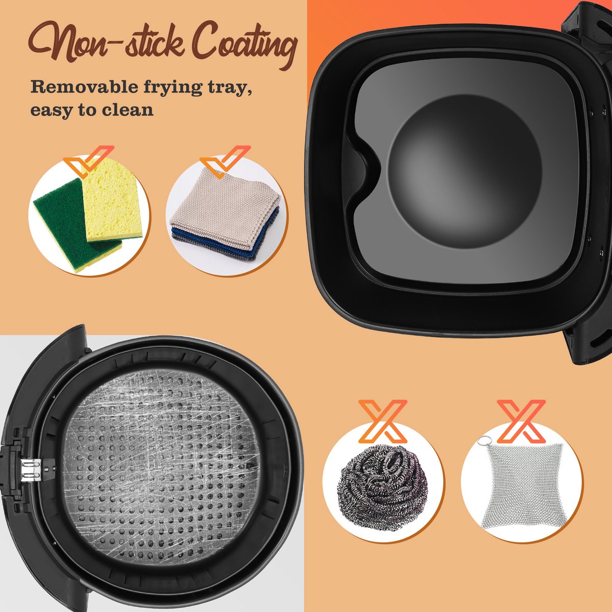 Een afneembare plaat met antiaanbaklaag en antislipvoetjes zodat de heteluchtfriteuse stabiel blijft staan. Daarnaast kan de frituurmand op elk moment opgepakt worden om zo het kookproces te controleren en met de handige geheugenfunctie zet je de oorspronkelijke proces voort wanneer je de mand weer terugplaatst.